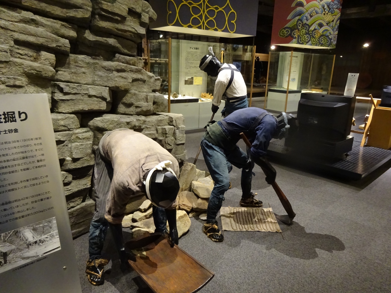 動物のはく製や、昔の生活道具の展示などは各地の郷土資料館によく見られますが、こちらの博物館は、「ハマ」(漁業開拓)、「オカ」(旧石器時代から現代への歴史)、「ヤマ」(砂金・鉱石・金などの地下資源)の三つをテーマとする展示がメイン。特に、当地ではかつて金の鉱山があり採掘で栄えていたという史実を初めて知ることができるなど、興味深い展示内容でした。