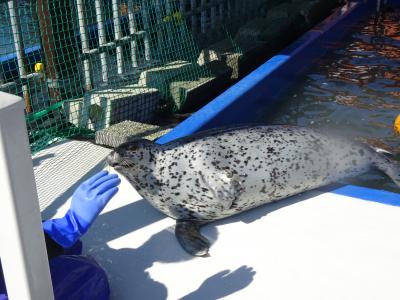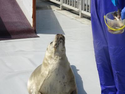お薦めはやはりトレーナー体験。1日3回の餌やりの時間(11:50・13:50・15:30)ごと先着5名までがトライできます。内容は好物のホッケを直接あげたり、握手やバンザイ、輪投げなど色々なメニューが。最後はスタッフの方がアザラシと一緒に記念撮影をしてくれます。