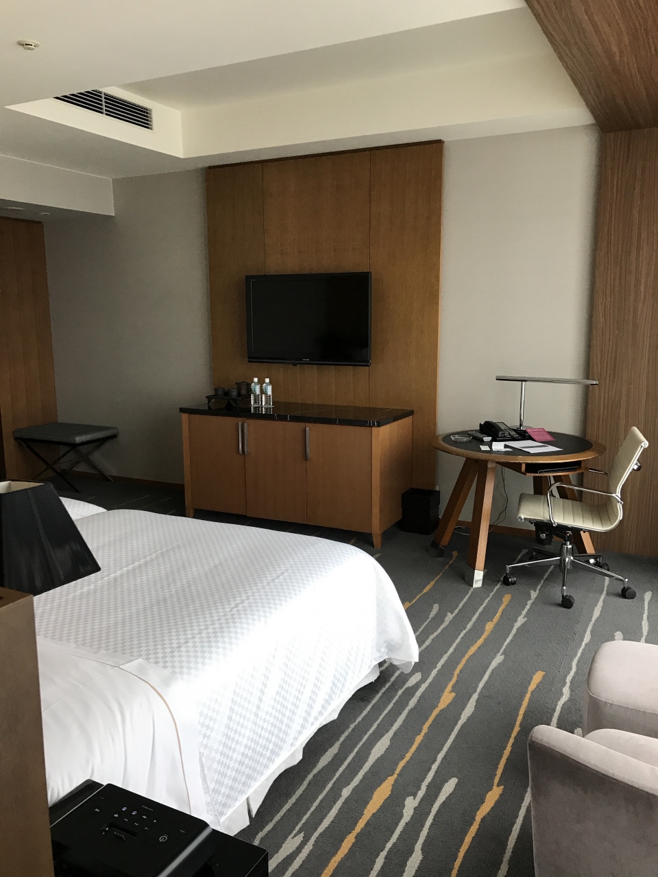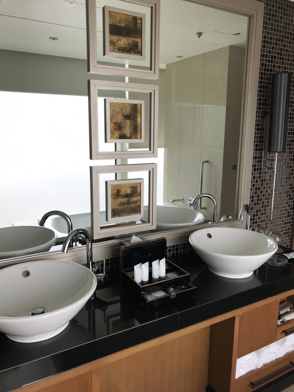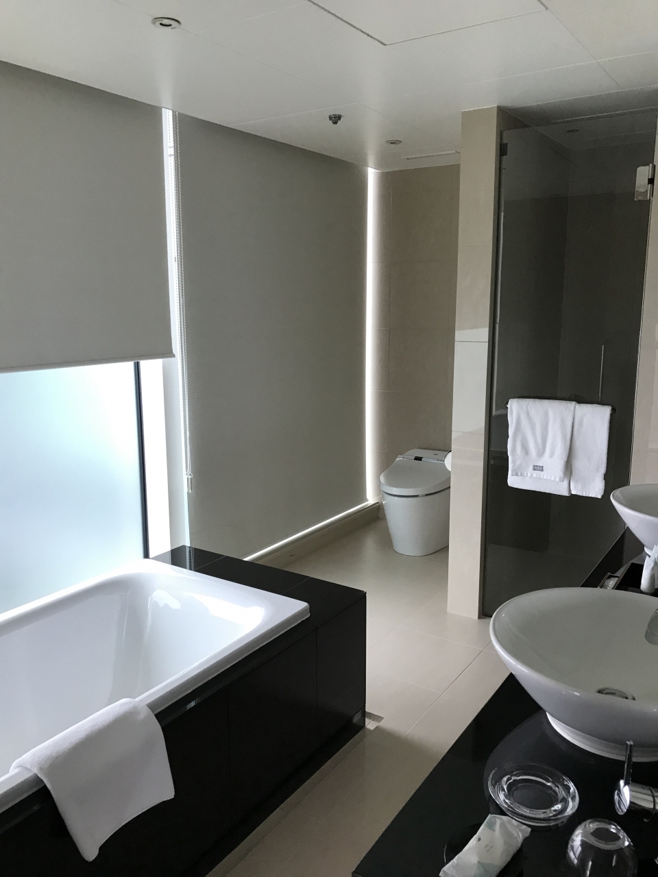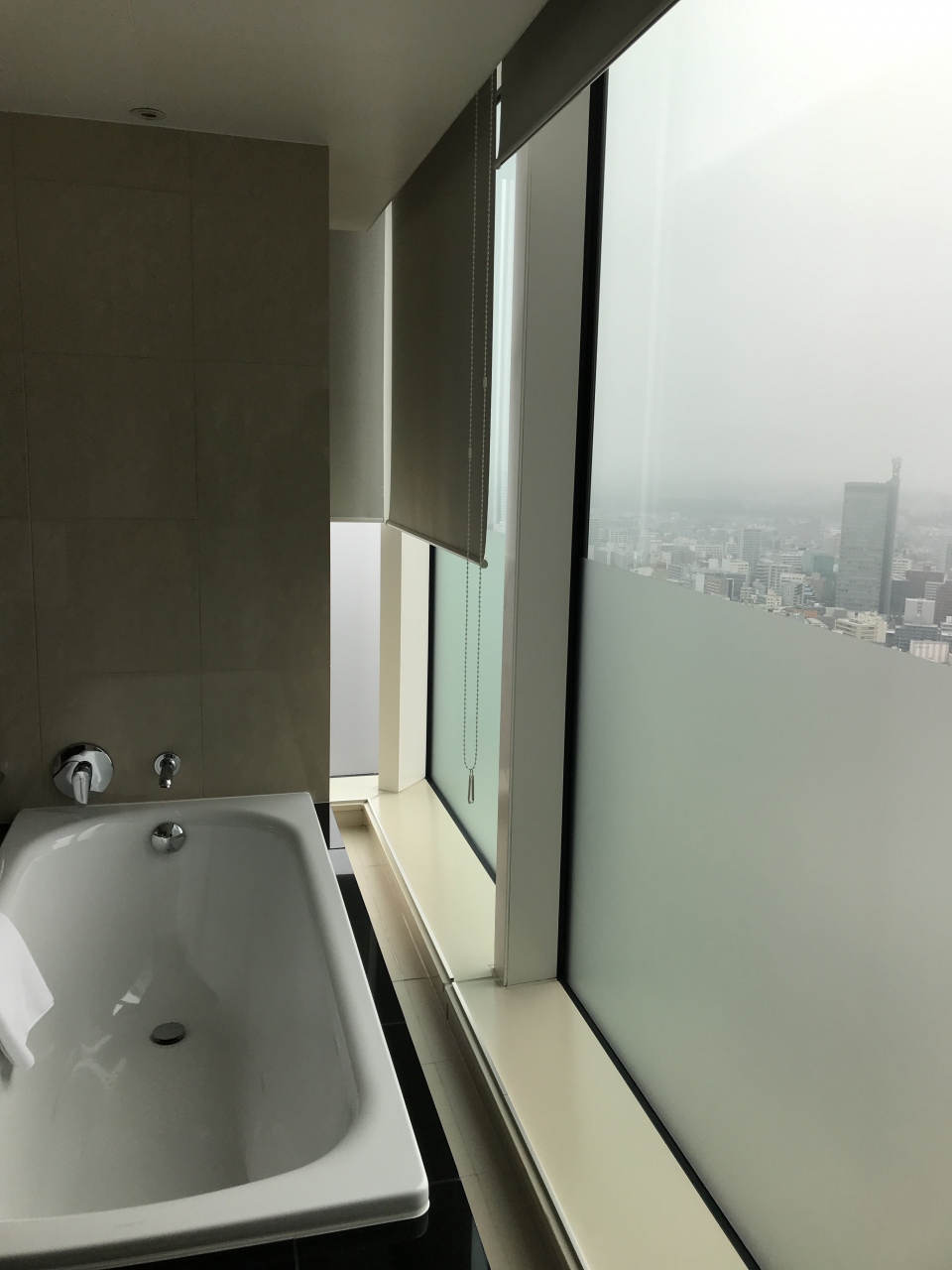 週末のんびりホテルで過ごすなら、やっぱりお風呂はビューバスで景色を見ながらゆっくりとリラックスしたいと思ったけど、残念ながらお風呂に入りながら景色は、全く見えず、残念。無念。窓がすりガラスになっていて、外から見えないようにしたのだろうけど、35階の部屋のお風呂を見る人がいるのだろうか?出来たら、外からは中が見えず、中からは外が見えるガラスもあるんだからそういうガラスにする事は出来なかったのだろうかと、。カードキーになっていて、、入室してからトイレをすぐ使用したら、便座が、冷たい!ヒヤッ!それもどーにか出来ないのかな?今までカードキーのホテルに泊まってもその事に気になった事がなかったのでびっくり。