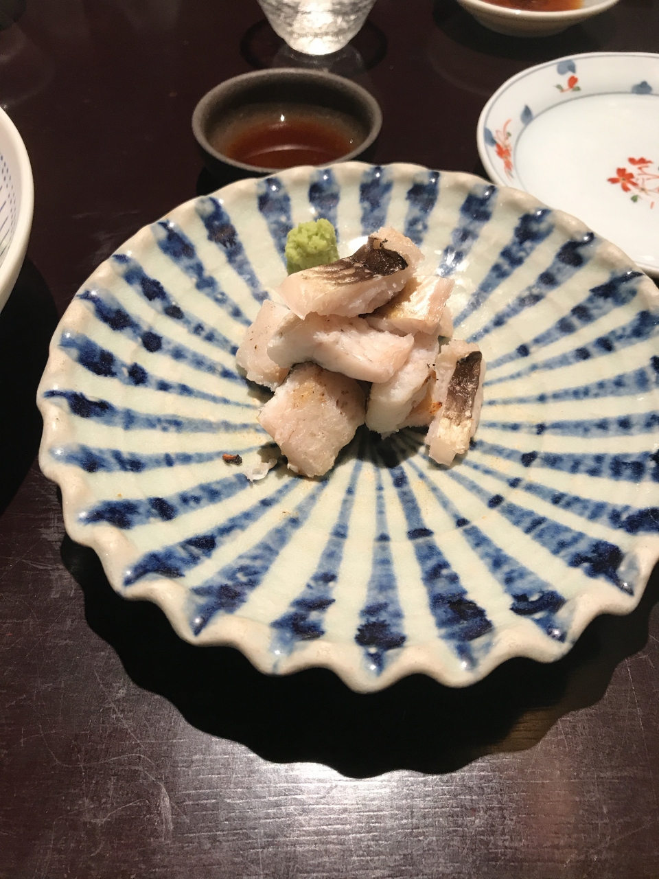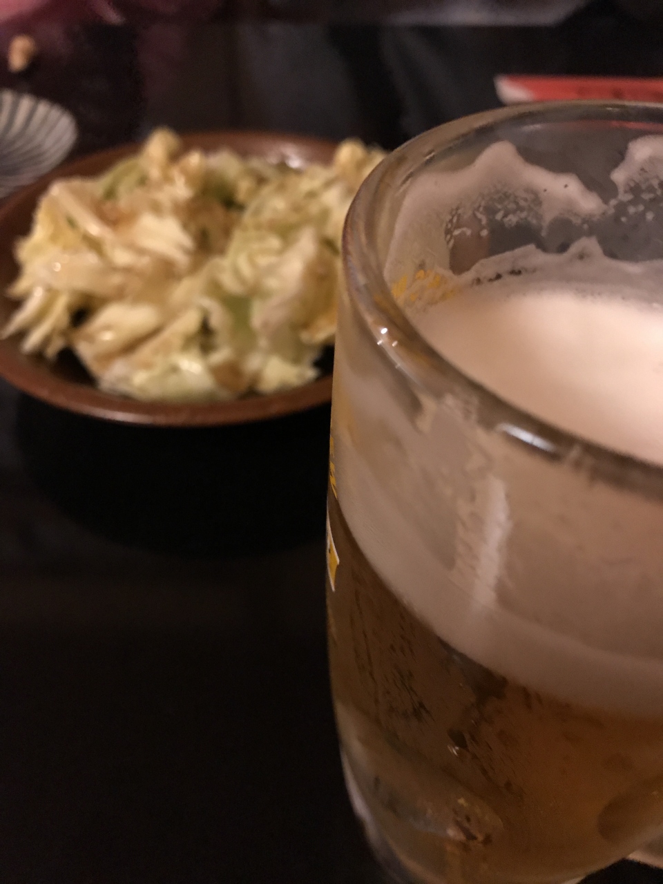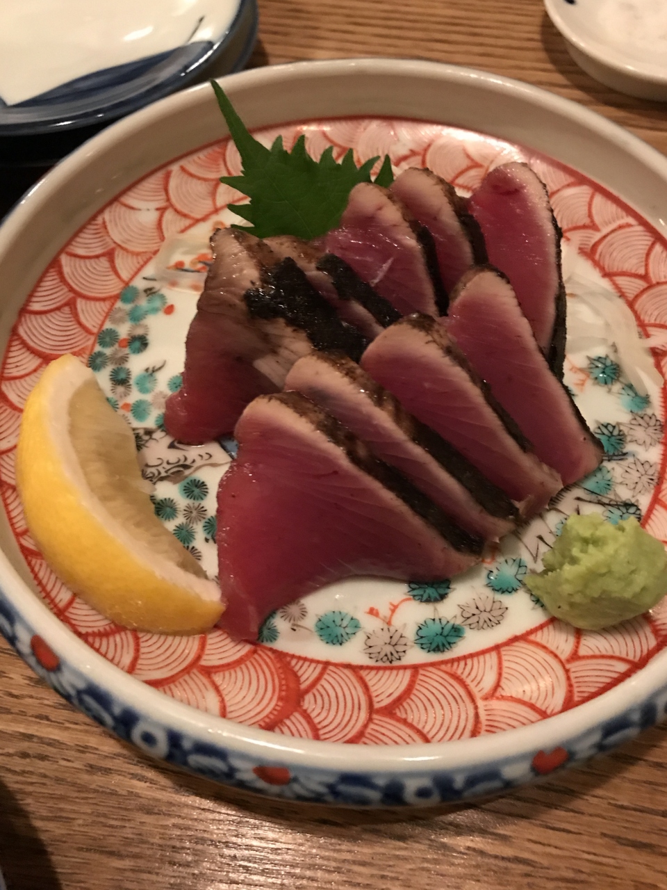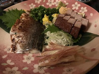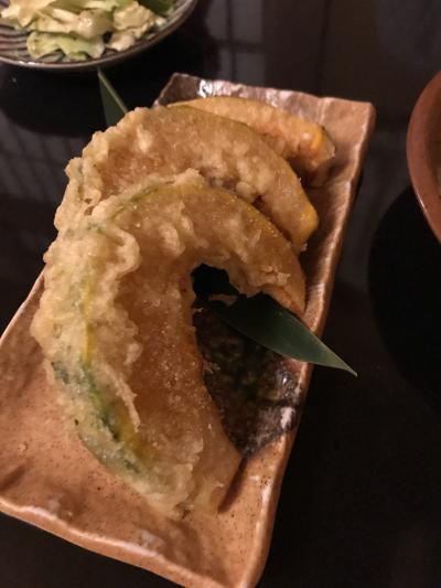 ラブホテル街の隙間にその店はありました。細い道を入っていくと、まるで自分の家に帰るような玄関が、いや、高級料亭と言えばそれもあり?不思議な空間の座敷に案内され、中は肩苦しくない感じの雰囲気。まずは、生ビールをいただき。お通しとして、生キャベツと揚げたてのカボチャの天ぷら。カツオと炙りサバを注文。ビールもなくなり、日本酒に、、