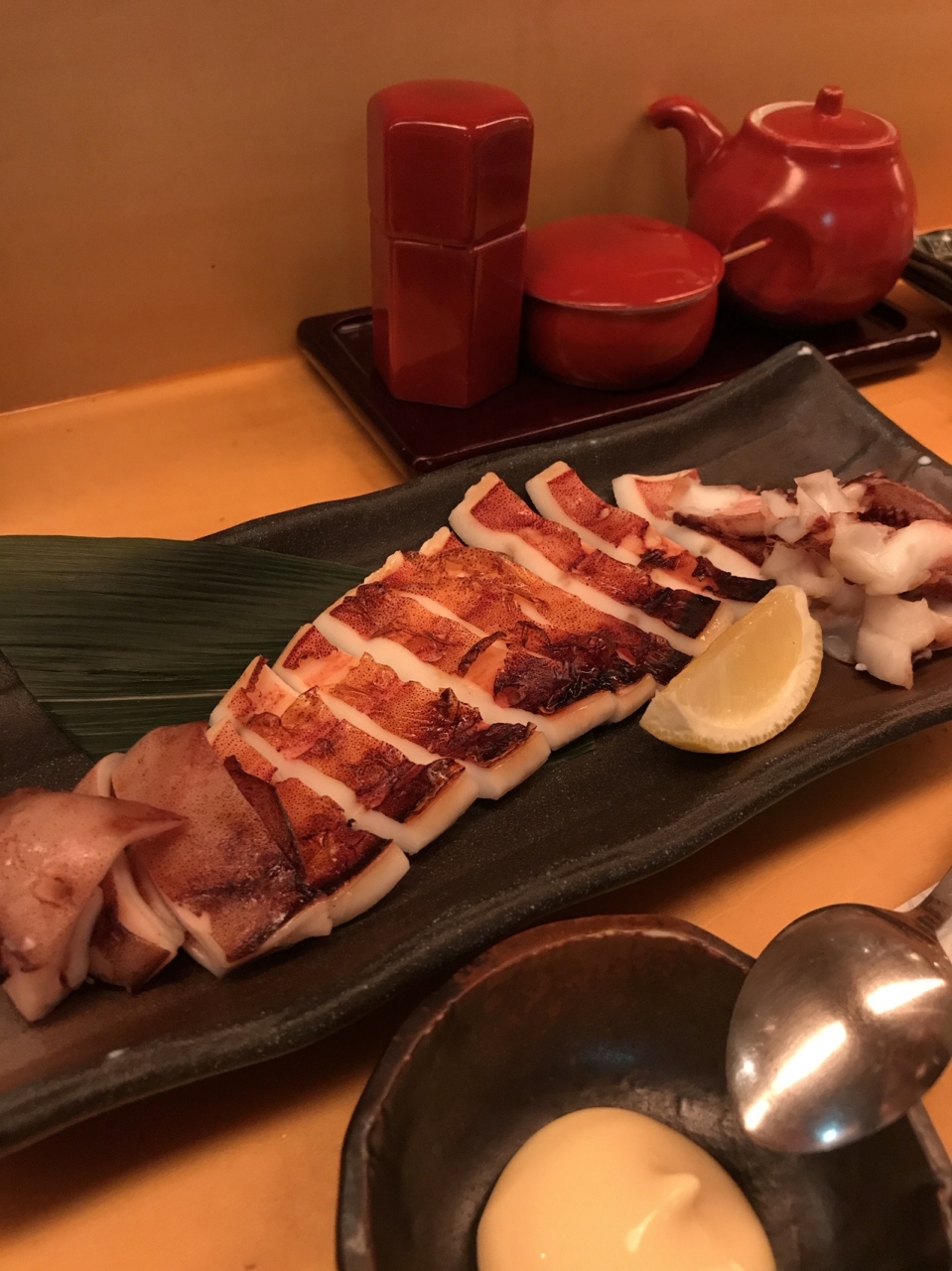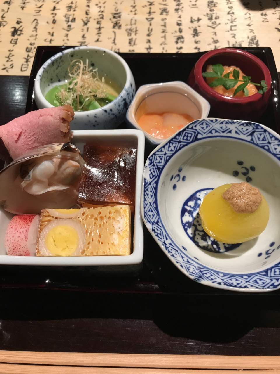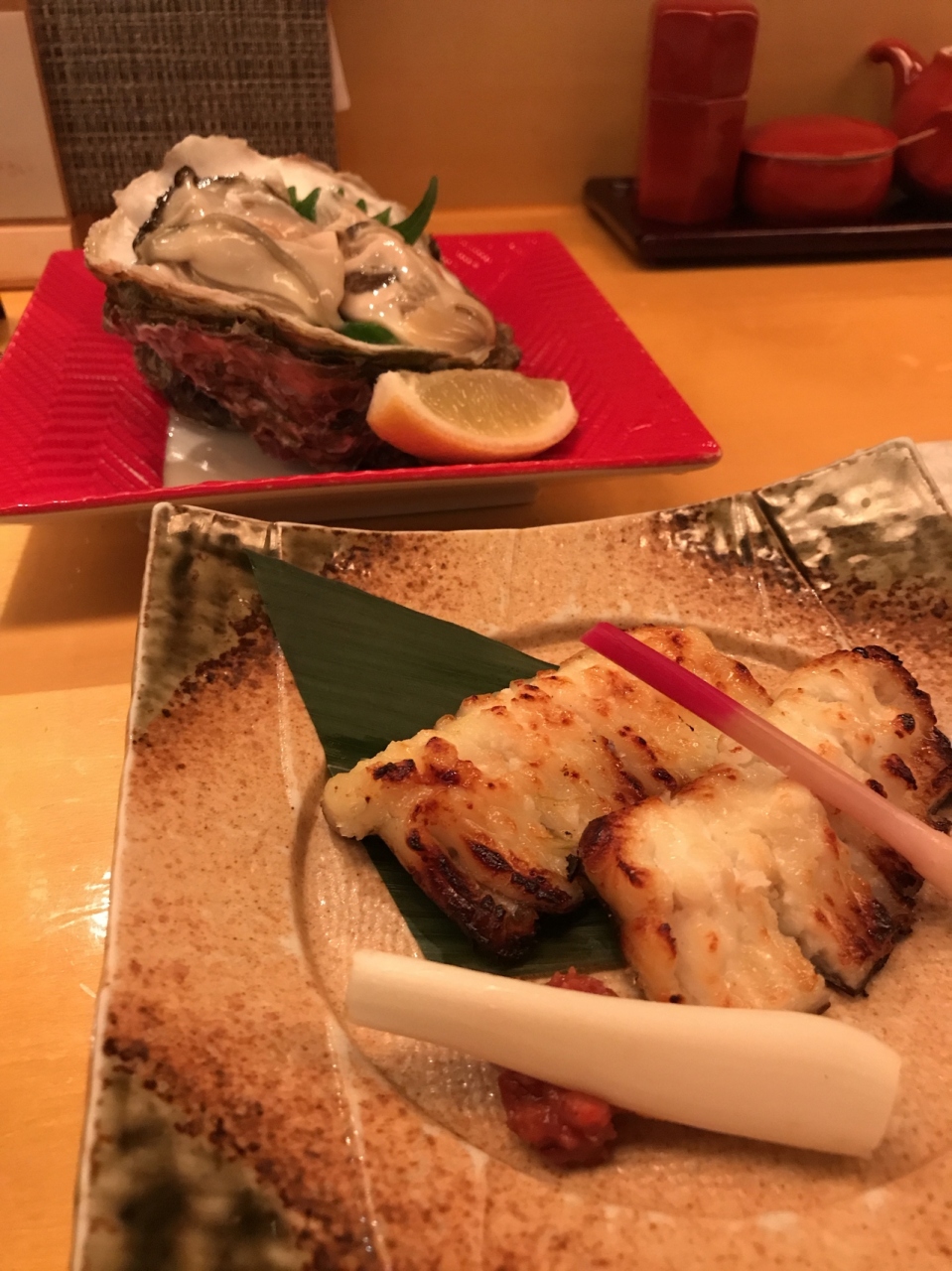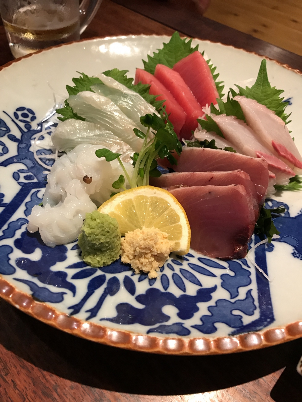 ラブホテル街の隙間にその店はありました。細い道を入っていくと、まるで自分の家に帰るような玄関が、いや、高級料亭と言えばそれもあり?不思議な空間の座敷に案内され、中は肩苦しくない感じの雰囲気。まずは、生ビールをいただき。お通しとして、生キャベツと揚げたてのカボチャの天ぷら。カツオと炙りサバを注文。ビールもなくなり、日本酒に、、