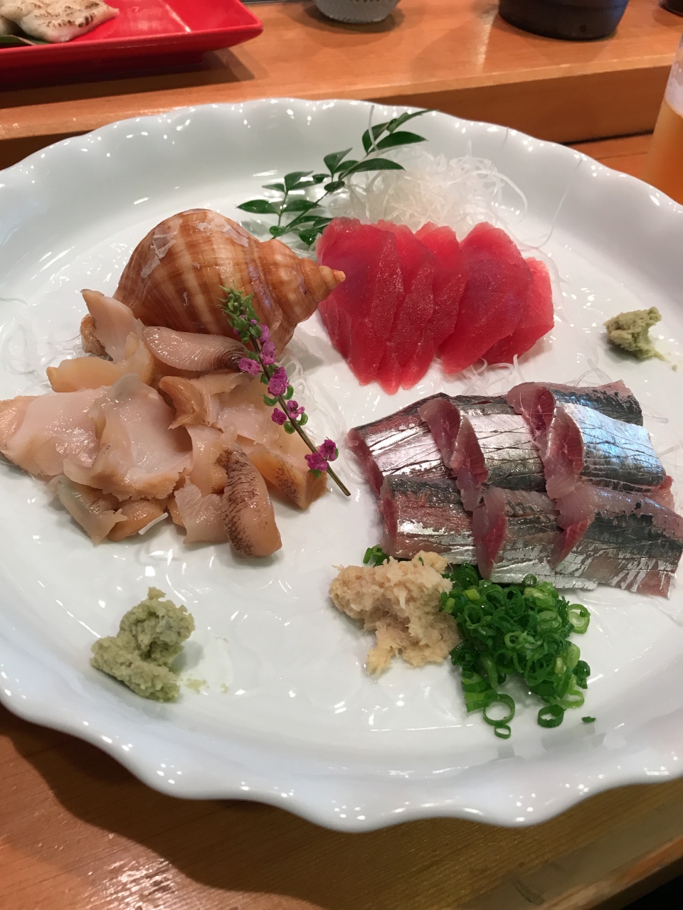 山菜の天ぷら、唐揚げ、仙台牛の炙り刺し。メニューは、もう少し種類があるとベスト。味は美味しい。- 旅行時期