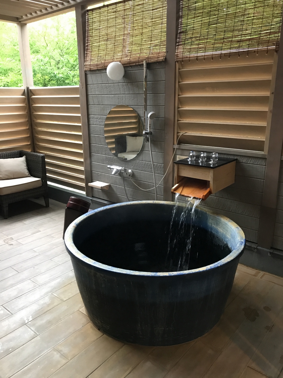 バブルの時に建てたのであろうか、かなりお金を使って作った感じ。プライバシーが守られるようにデザインされてるようです。テラスに露天風呂付のお部屋で、この値段。悪くないかも。- 旅行時期
