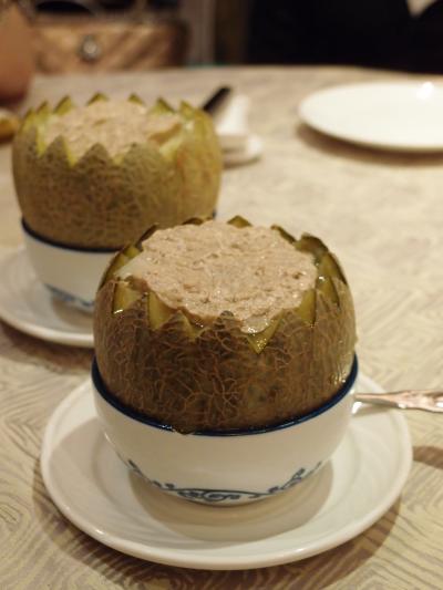 密瓜盅メロンをくりぬいて、その中に鶏肉、玉子、そしてジャガイモを煮込ん...