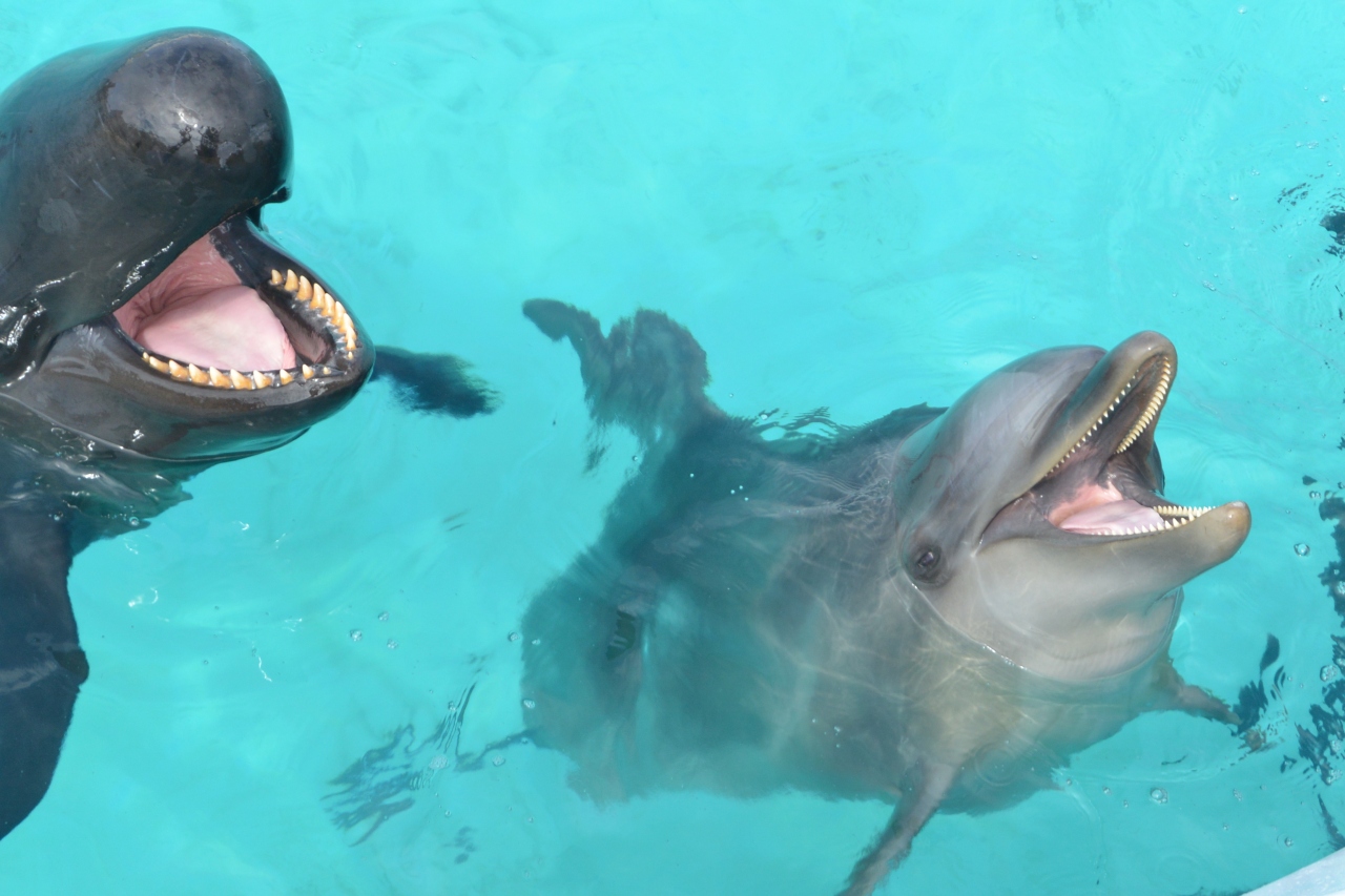 かなり近くで大口開けた餌を待つイルカに会えます。