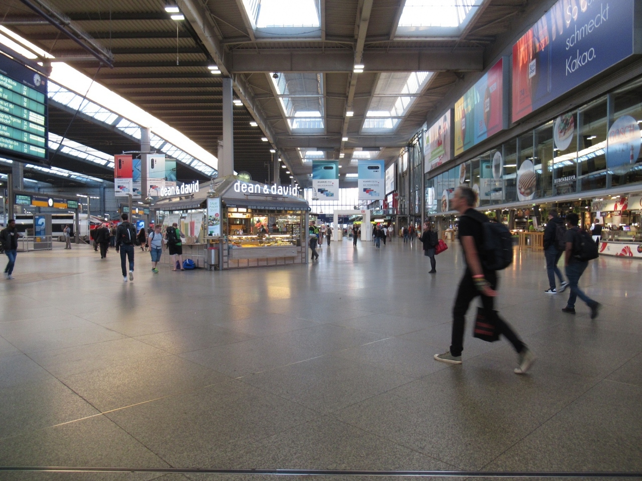 長時間電車に乗る人が多い影響か、駅舎には、コンビニのようなお店だけではなく、ホットドックとかプリッツエルなどの軽食が買えるスタンドが沢山ありました。