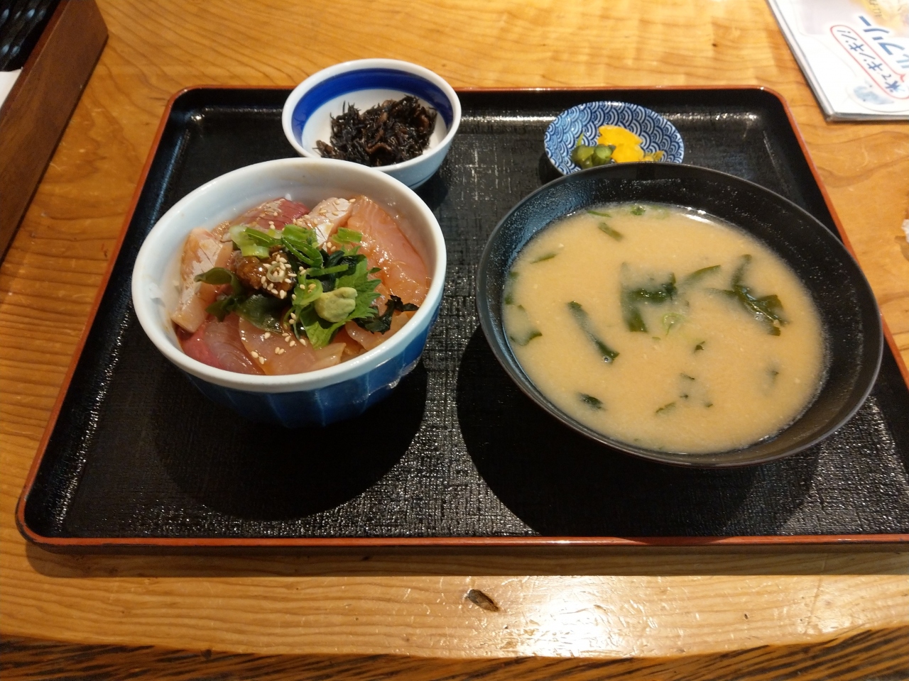 いざテーブルにつくと、やっぱ鯛めしはいつか宇和島で食べようかなと思いはじめ、讃岐のはまちたっぷりの漬けハマチ丼が気になり