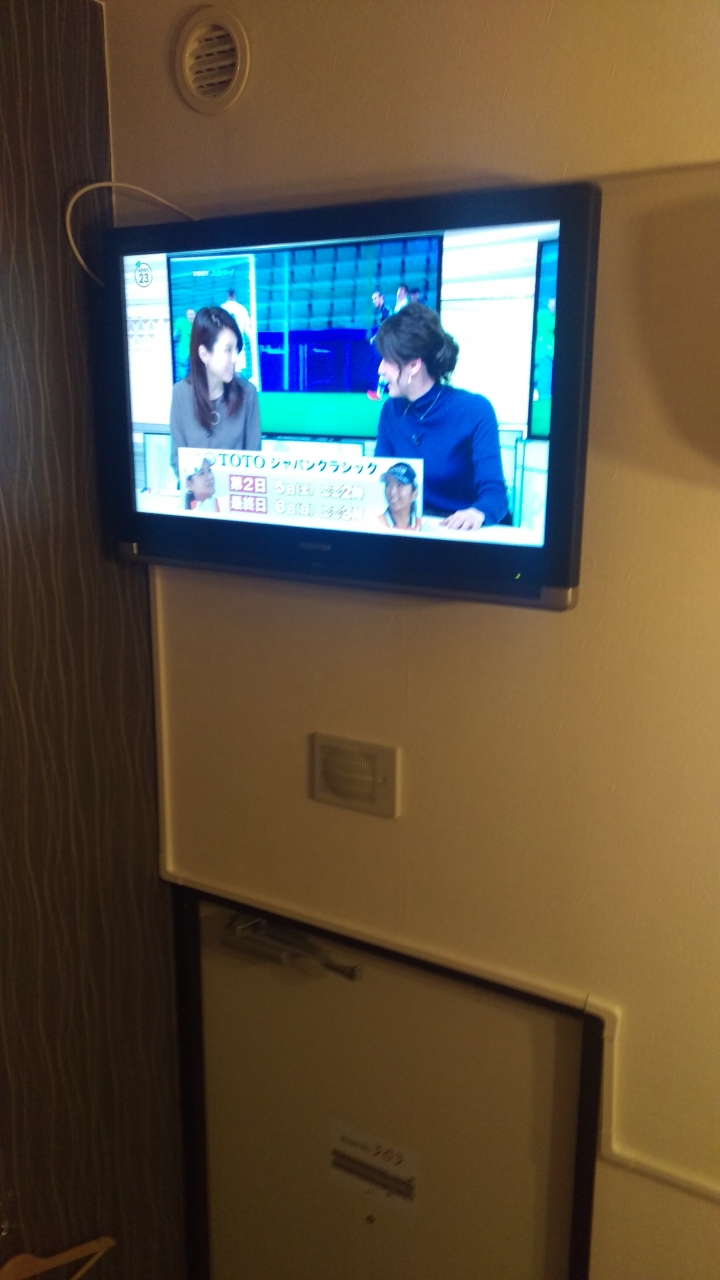 部屋のドアを開けると想像以上に高いところにロフトベッドがありました。テレビはドアの上についていて、かなり高いところにあります。