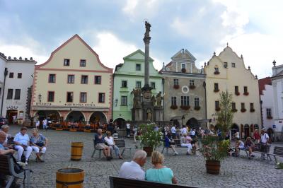 チェスキークルムロフの旧市街地の中心にある広場でたくさんの観光客がいます。