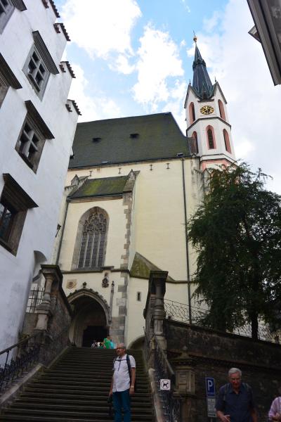 チェスキークルムロフ城側から旧市街側を眺めた時に一番目立っている建物がこの教会です。スヴォルノステイ広場からすぐの路地を入ったところに入り口があります。たくさんの人が訪れて中を見学していました。ちょっと階段は急ですが、西洋のお年寄りの方々は頑張って登って見学していました。