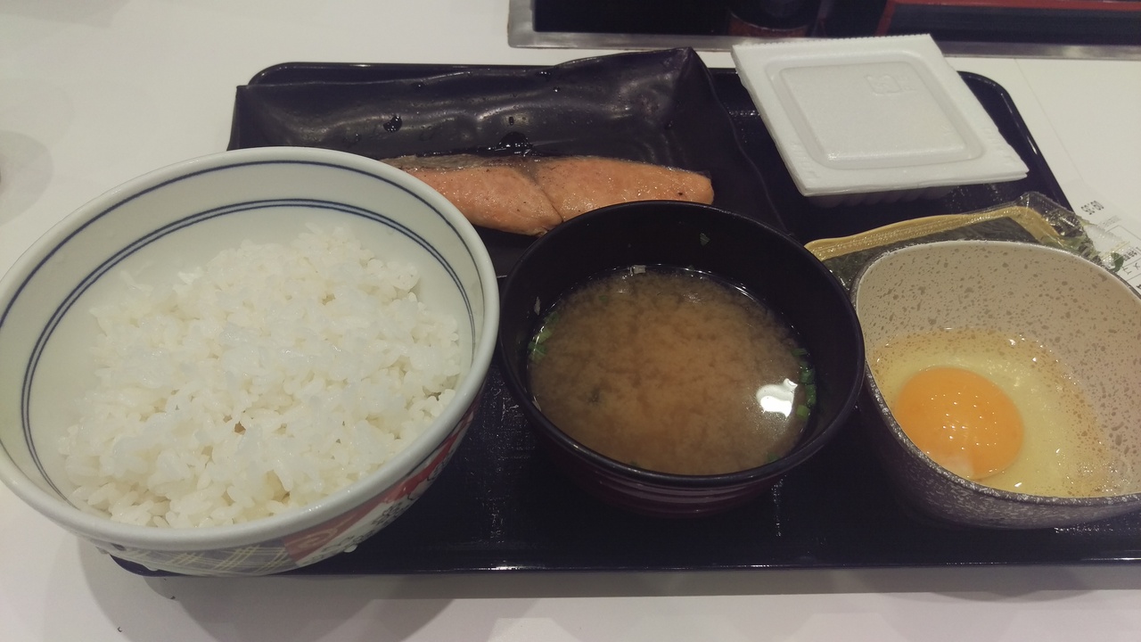 普段なら牛丼ですが、体がお米、焼き鮭、納豆、味噌汁を求めていたので特定食をいただきました。