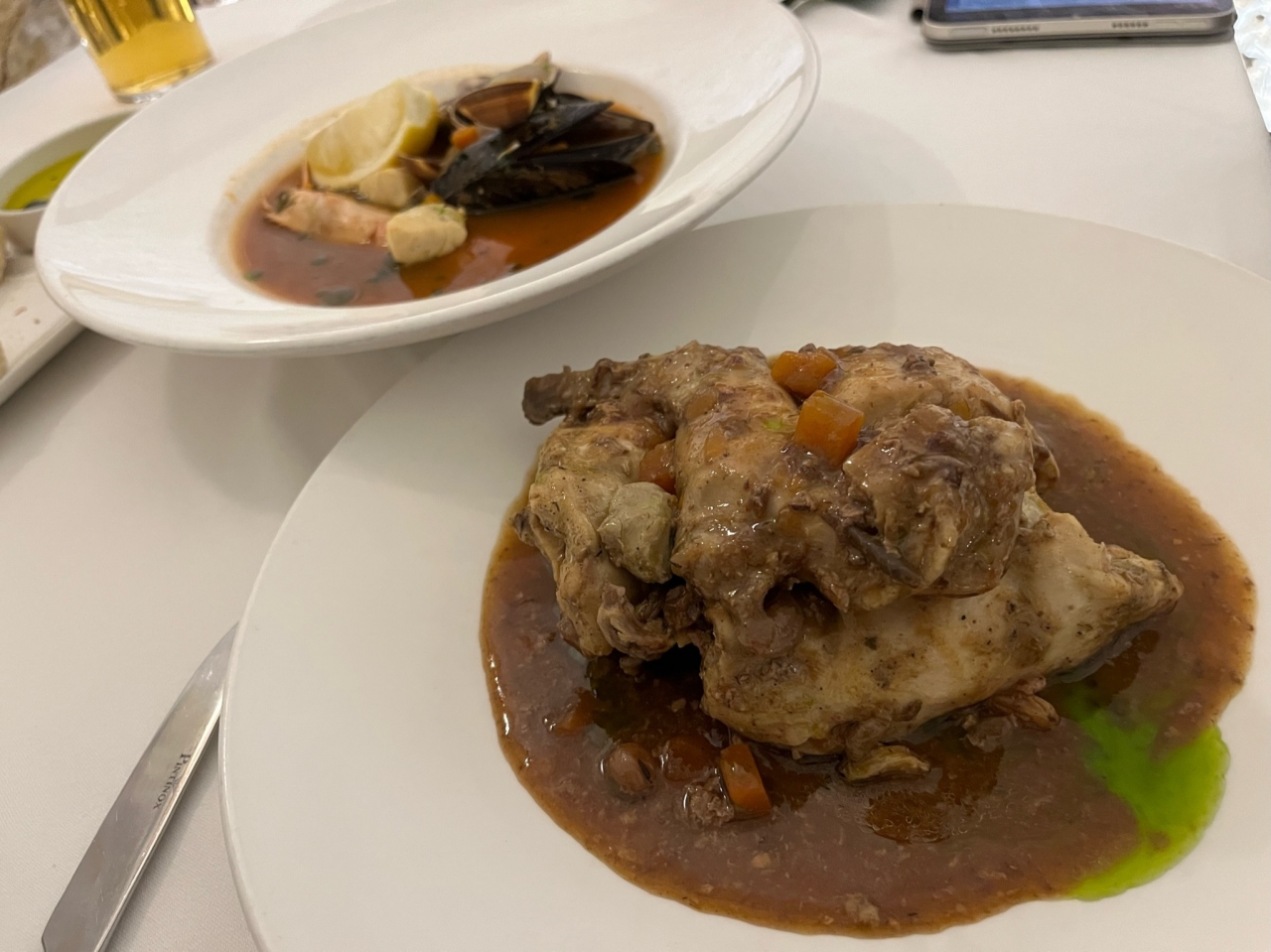 バレッタに到着して、バスターミナルからも近くにあるレストラン。店内はとてもおしゃれな雰囲気があって素敵です。注文したのはうさぎ肉の煮込みとアリオッタ。うさぎ肉は柔らかく煮込まれていて非常に美味しかったです。2人でアルコールを2杯ずつ注文して合計60ユーロでした。