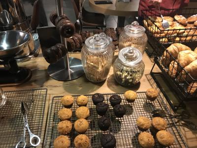 朝ごはんは、いろんな種類のパン屋デザート、ハムやチーズも数種類、2泊してもすべての種類食べきれないほど豊富です。