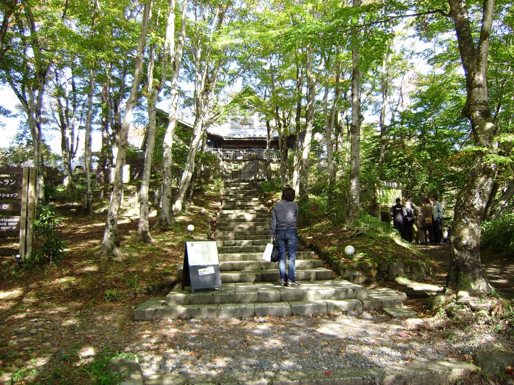 ロープウェイの乗り口にある駐車場を出発。ゆっくり歩いて一時間の道のりですが、山道は広く、勾配もあまりないので苦になりません。また、周囲の山々の紅葉が素晴らしく、飽きることなくあっという間に到着します。