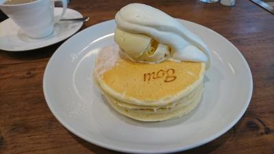 難波で同行者と待ち合わせてパンケーキの「mog」へ。この時間12時半。...