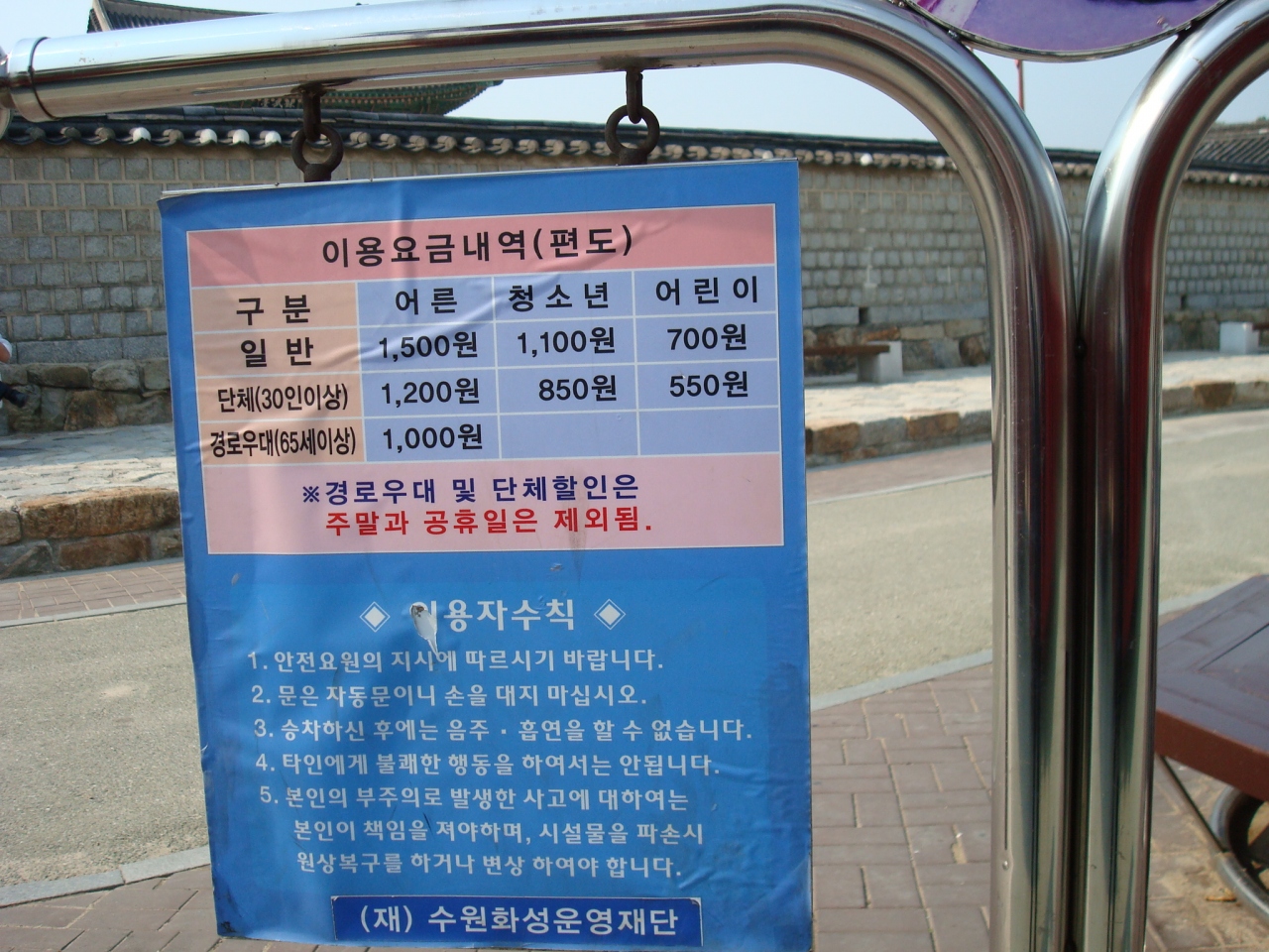 かって1周した華城も最近は、必ずといっていいくらい観覧バスで間引きです。観覧バスは、所要15分、1500wです。料金表に65歳以上1000wとでていたので同行者が該当しますと申し上げたところ、韓国人のみとのことでした。これからいかれる方々、くれぐれも私の二の舞をされぬように。1000wというのは、決して高い料金ではないようです。