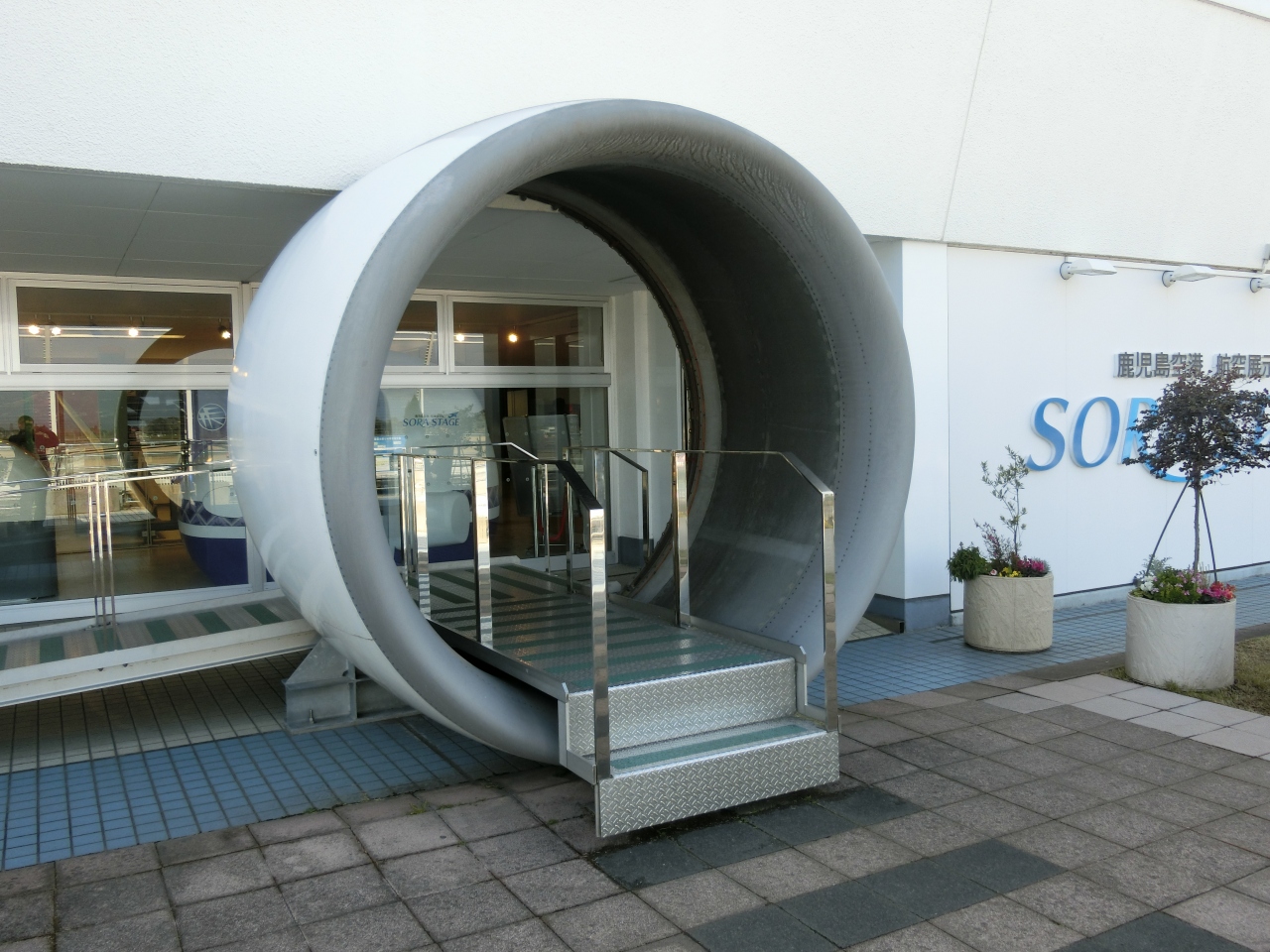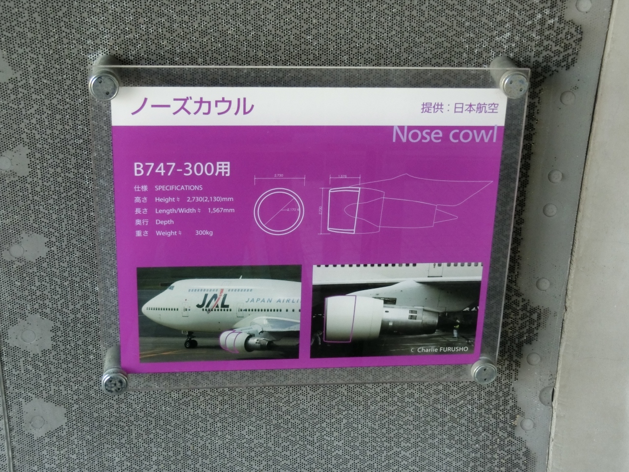 日本航空(JAL)のB747-300型機で運用されていたエンジンカウルが展望デッキ側からの出入り口にあります。
