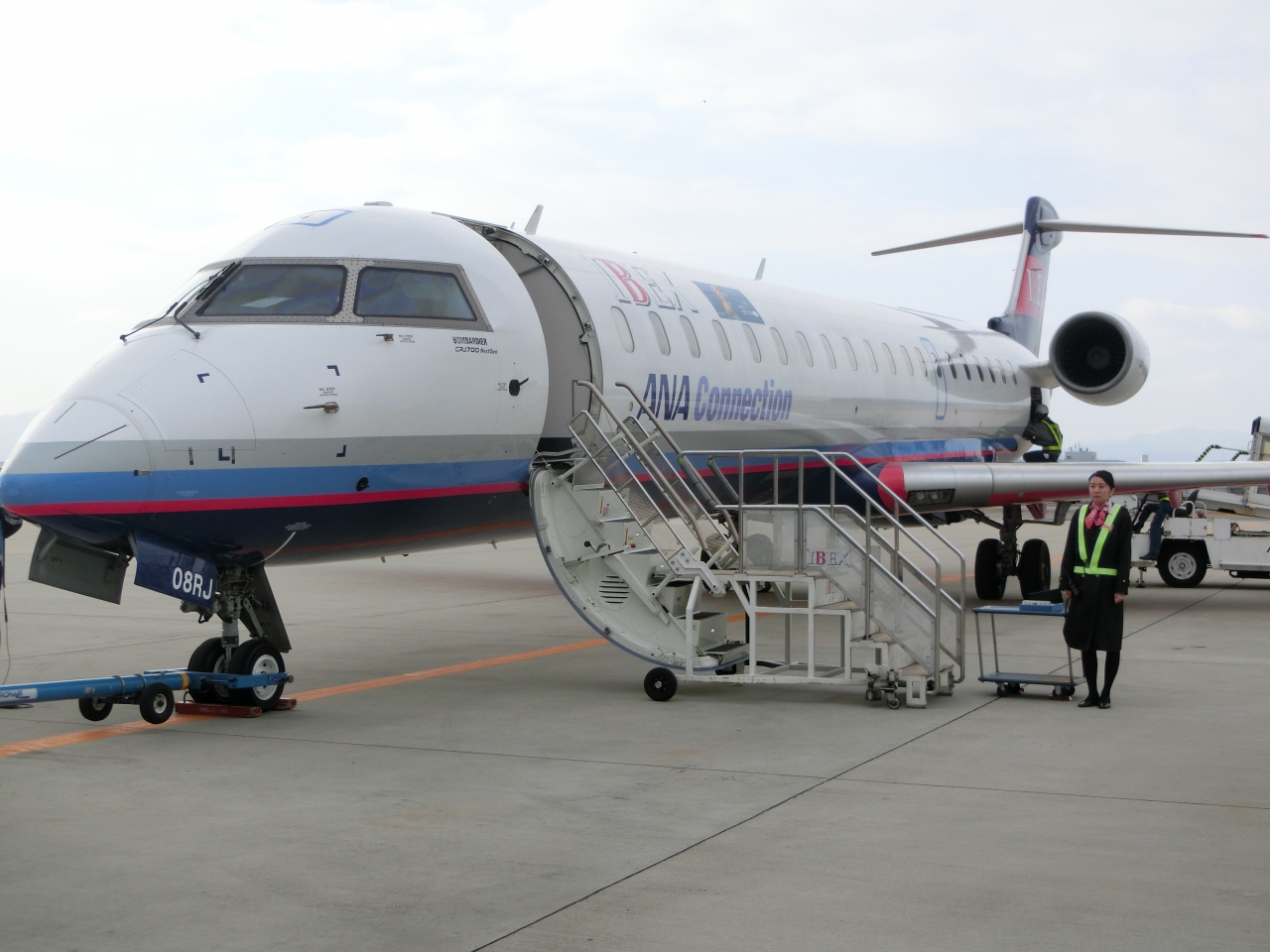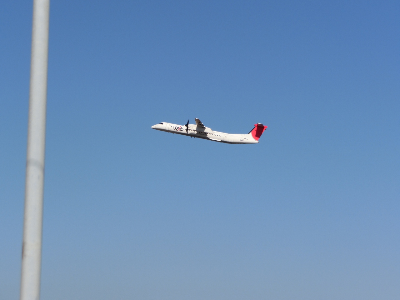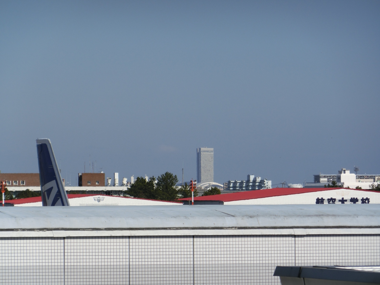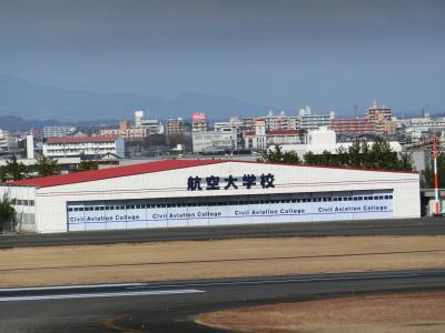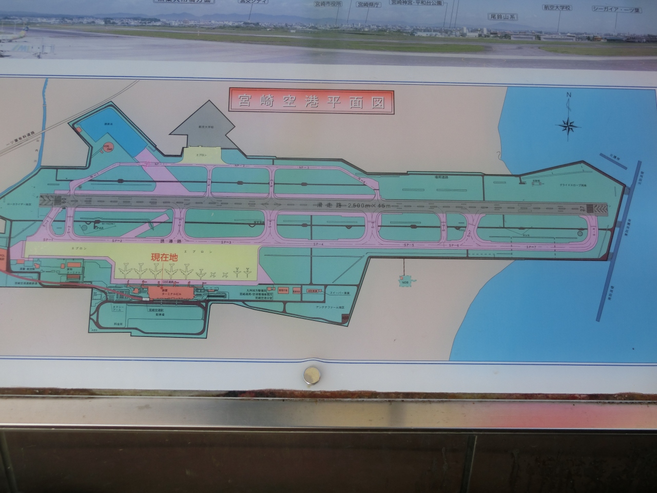 JR宮崎空港駅が隣接。展望デッキにはR/W?入りの全体図。空港前にはヤシの木と。忘れちゃいけない?航空大学校も。