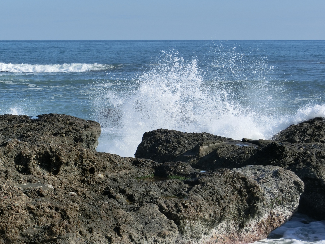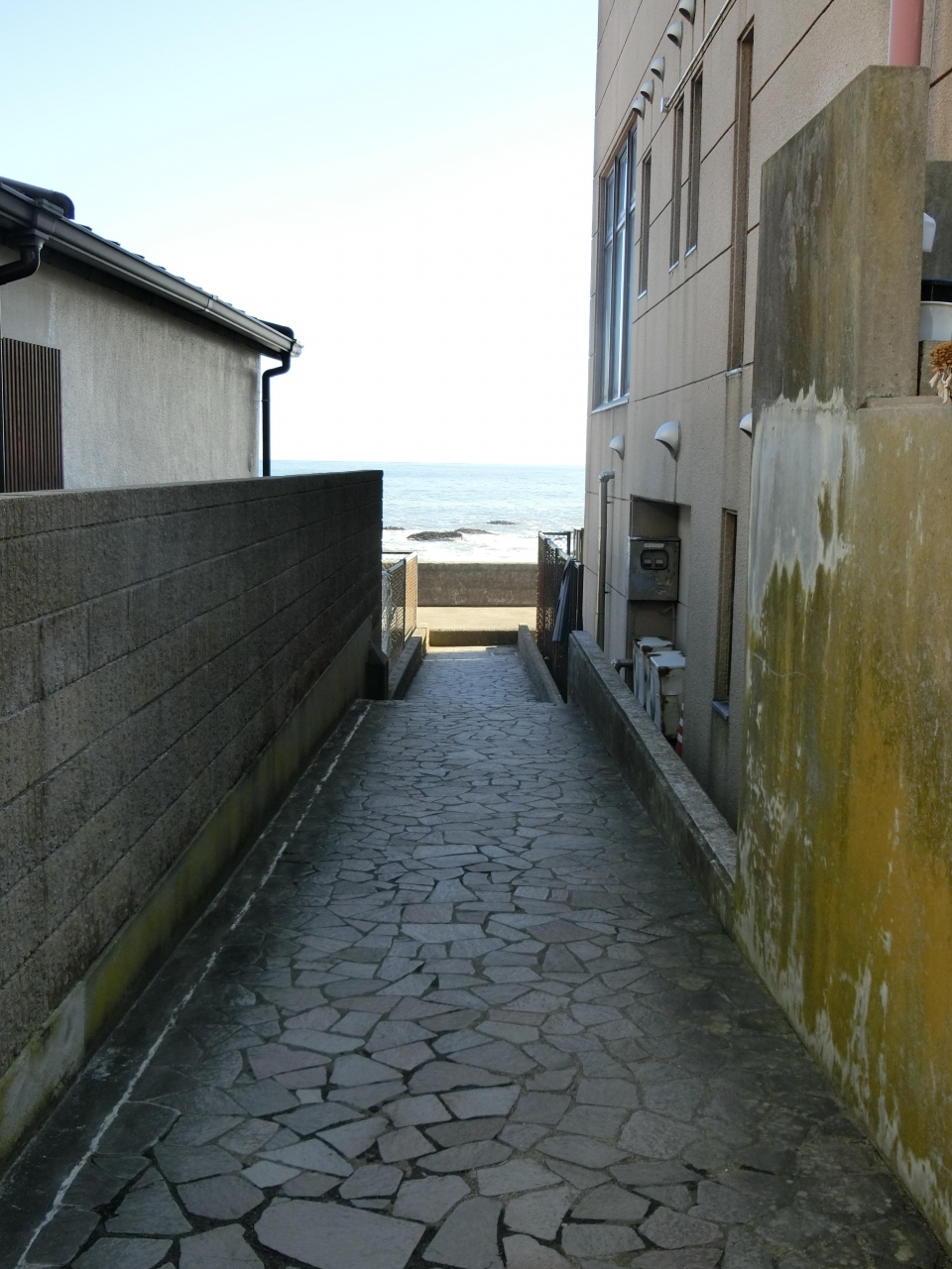 ・境内から石段で下りて、石段正面の横断歩道を渡り、旅館の間の通路を通り抜けると太平洋が目の前に広がります。