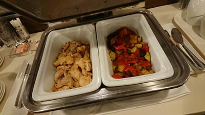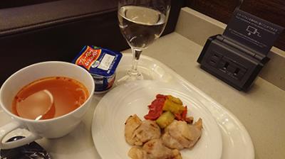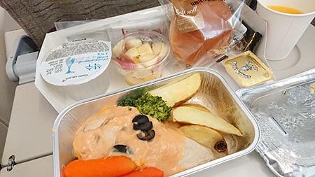 ホットミールが出ることにびっくりしながら、チキンをもぐもぐ(大好き)
