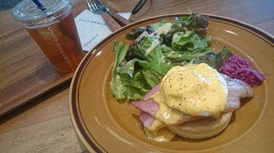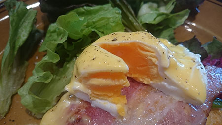 さて今回、電源を求めてうろついていた中で、こちらの奥の席にコンセントタップありの席があるとのことで、さっそく来店。朝食はクロワ………いやいやエッグベネディクトがあるじゃない!とチョイス。
