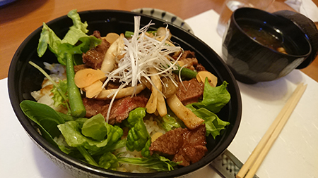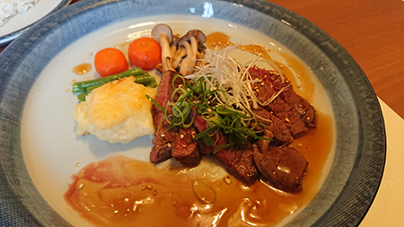 牛かつ、お箸でさくりと切れる……もちろんステーキのお肉も、ごはんの上のお肉も!柔らかくて味付けもよく、あっつあつ。どのお料理もおいしくて笑顔いっぱいになりました。