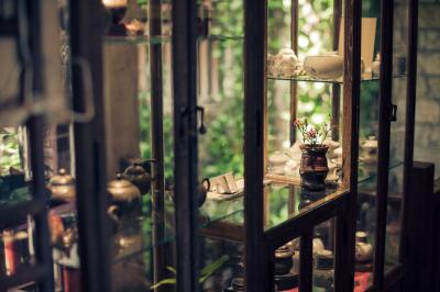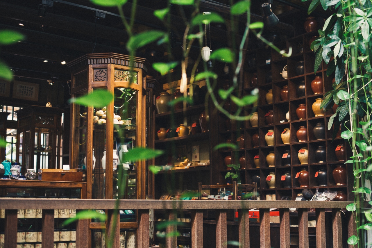- これが一番のオススメ。九份で一番古い建物だそうで、建物の中に池があり、鯉が泳いでいます。緑が涼しげです。お茶のつぼが棚一面にあり壮観!