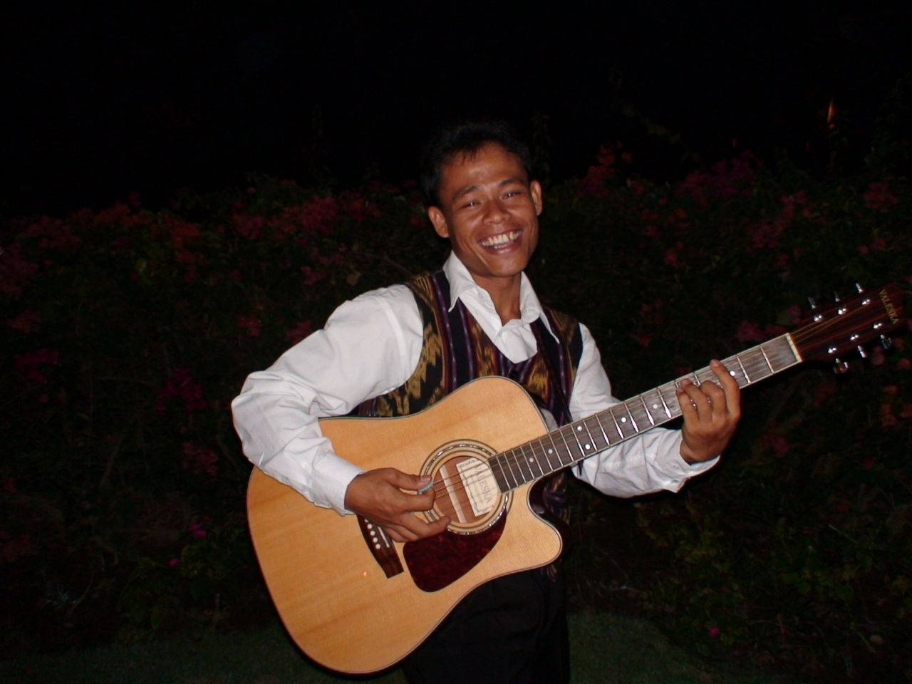 新婚旅行だったのでメモリアルキャンドルディナーを頼みました。料理のコース内容は予約時に指定できました。夕方になるとヴィラの庭中にキャンドルが置かれ,食事の前に灯が入りました。料理は前菜,スープ,メインディッシュ,デザートといった構成で2時間半くらいかけてゆっくりいただけました。最後にはフォークギターのデュオの生演奏があり,リクエストOKで4曲くらい聴かせてくれました。これが最高でした。彼らはレパートリーが広く,かなり愛嬌があり歌も演奏も上手でした。