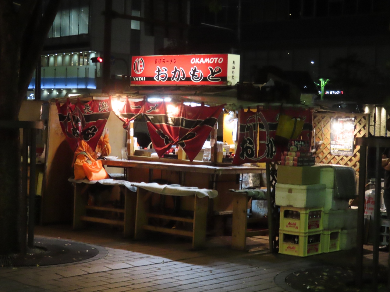 人が多くて待ち時間が長かったため中州で断念した博多の屋台ラーメンでしたが、渡辺通を天神方向へぶらぶら歩いていたらこちらを発見。無事、本場の博多ラーメンがいただけました。幅広の歩道上で中州のようにぎゅうぎゅう詰めな感じではなかったので、ゆっくり過ごせました。