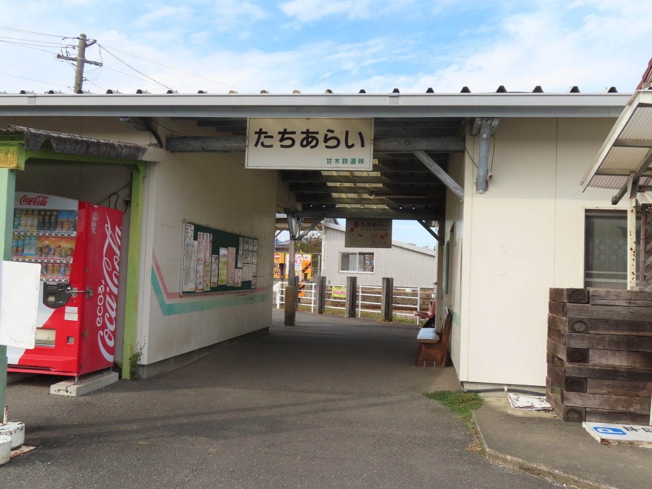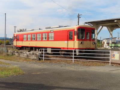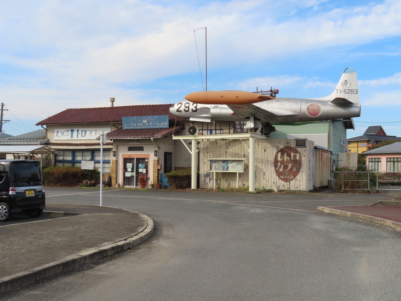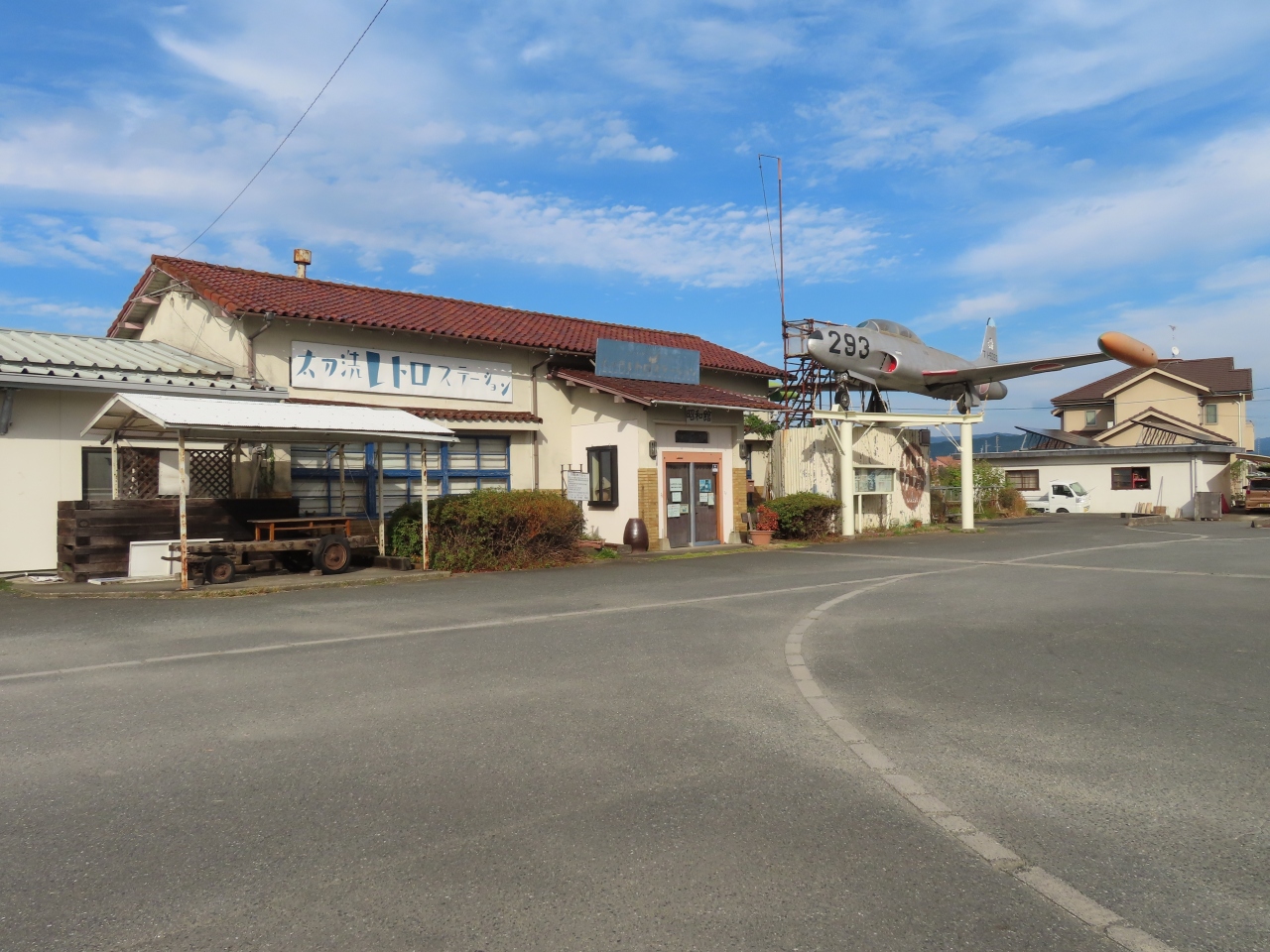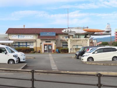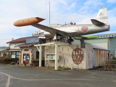 「震電」見たさにやってきた太刀洗平和記念館。そのお向かいにはローカル私鉄(旧国鉄ですが)甘木鉄道の太刀洗駅があります。その駅舎を利用して営業しています。一番の見どころは高く掲げられたT-33という航空自衛隊で使われていたジェット練習機です。翼端のオレンジ色のタンクがかわいらしい。