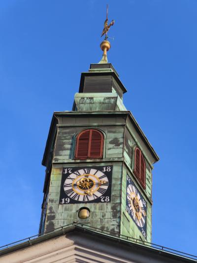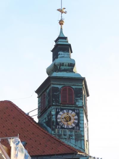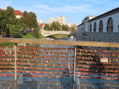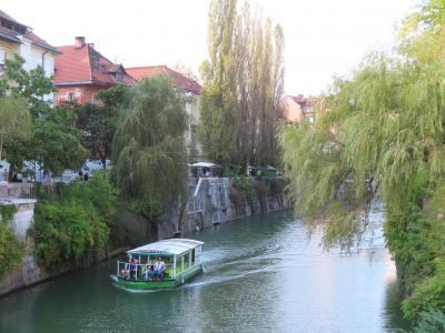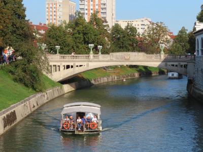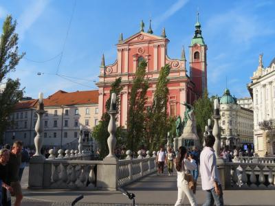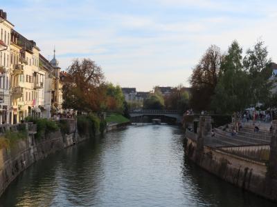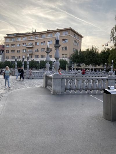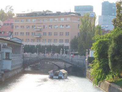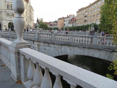 旅行社ツアーでの観光。スロベニアの首都リュブリャナ、その旧市街の真ん中を流れる川にかかる橋のひとつ。かつて馬車が通った幅広の橋の左右に、人専用の細いのを架けたので三本橋に。ドローン映像なのか上空から見ると美しいのですが、地上からではわかりにくいのが残念。