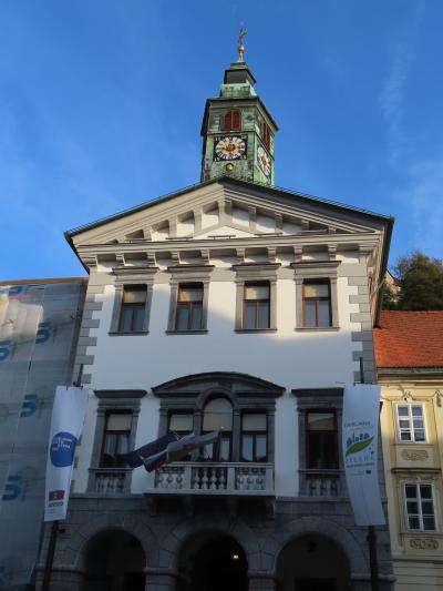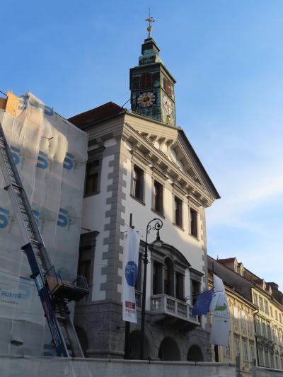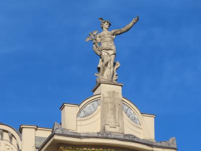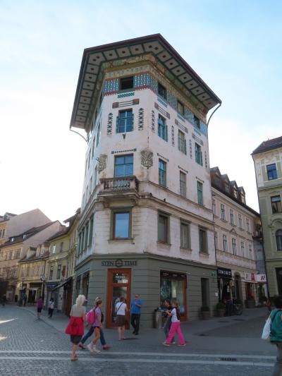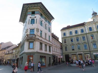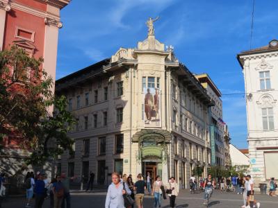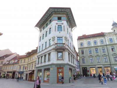リュブリャナ三本橋新市街側の広場、一番目立つ赤い教会の右側にある美しい建物です。高級ブランド店が入っている商業施設のようですが、元は何だったのでしょうか。名のある建築に違いないと思います。てっぺんのエルメス像が有名なんだそうです。
