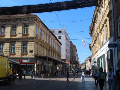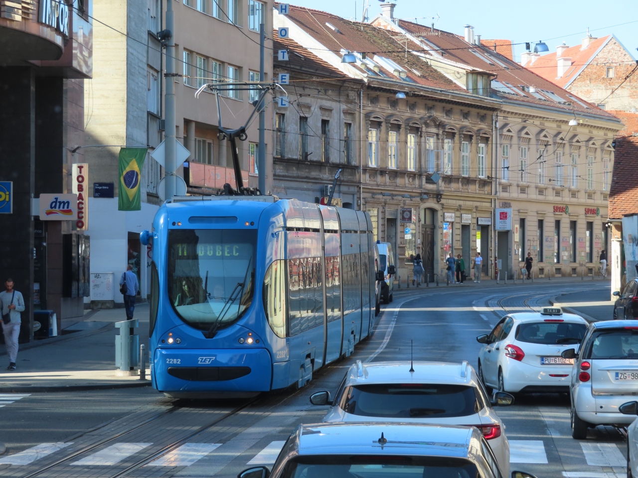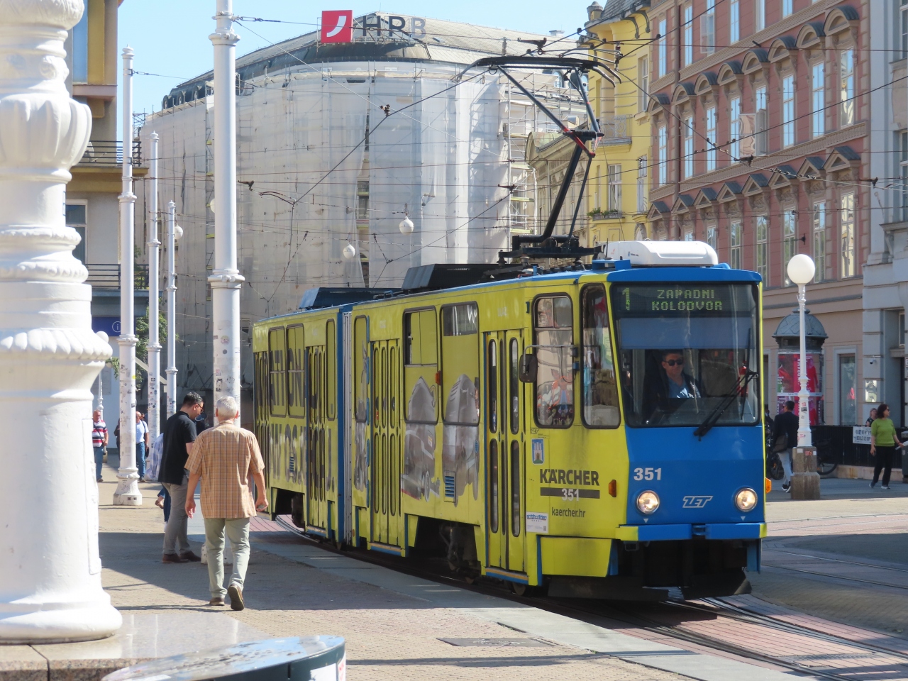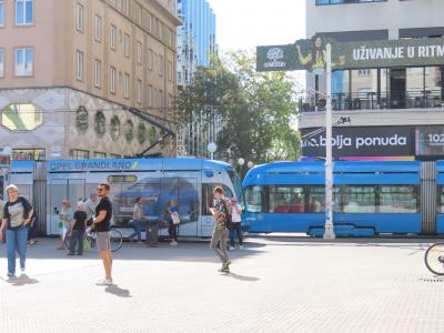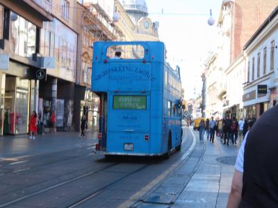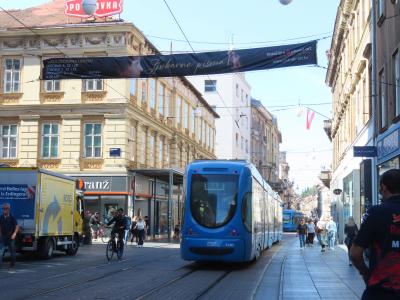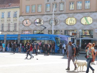 旅行社ツアーでの観光。イエラチッチ総督広場に立つと、ひっきりなしに青いトラムが行き来するのが見られます。新しい低床型のにまじってセミレトロな車両も元気に走ってました。路線バスも同様のカラーのが多かったです。