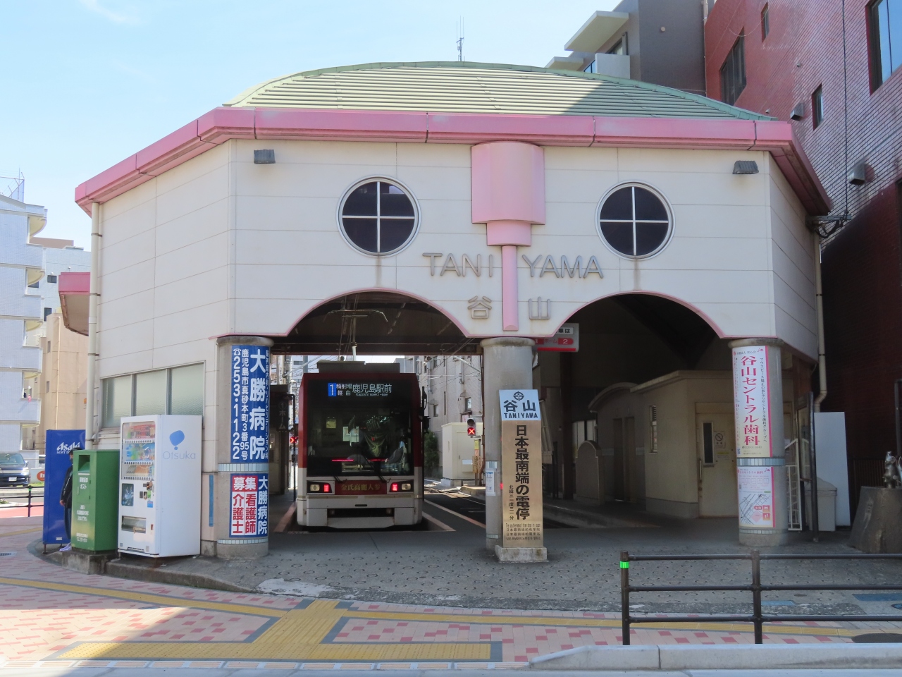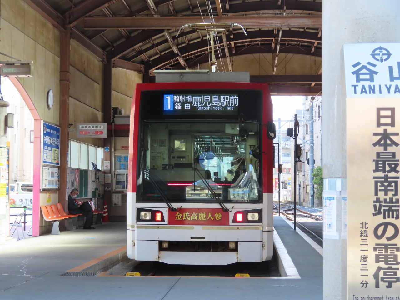 鉄道旅でほぼ九州一周しましたが、とてもユニークな「顔」をしたこの駅(電停)に来たくて、わざわざスケジュール合わせました。鹿児島市電の西の終点で、JR谷山駅からも徒歩10分いらないくらいです。東の終点のJR鹿児島駅前(中央駅でなない)まで乗りました。均一料金なのでたくさん乗ってください。