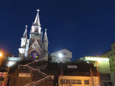 鉄道ひとり旅で佐世保で一泊しました。利用したホテルのすぐ隣りがこの教会でした。斜面上に建てられていて、国道側は高い崖になっています。市街散策の帰り、崖の下から眺めたのがこれ。すばらしくキレイ。ヨーロッパの街の切り取りにも見えます。