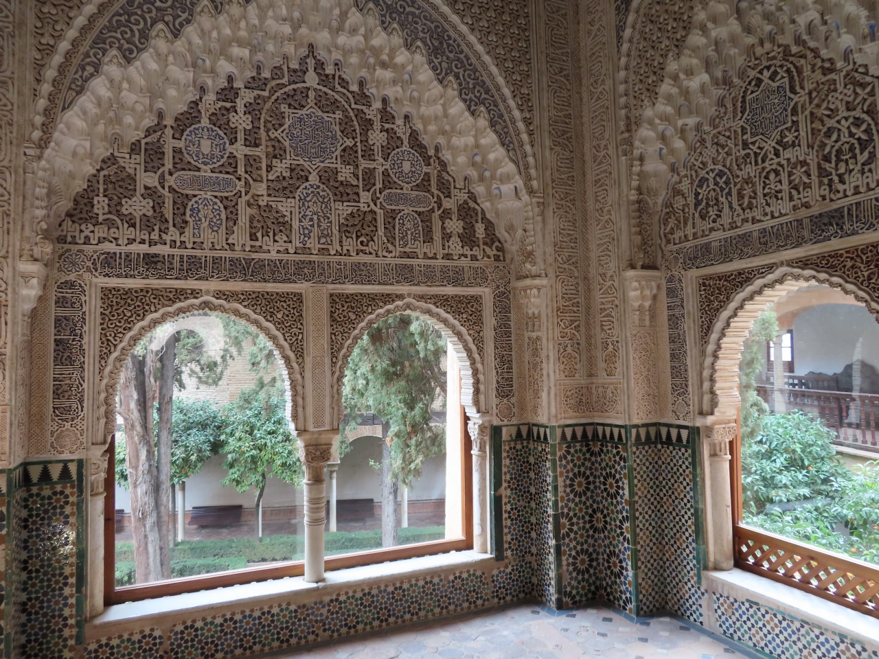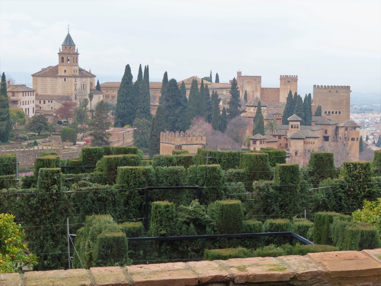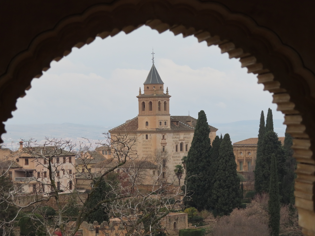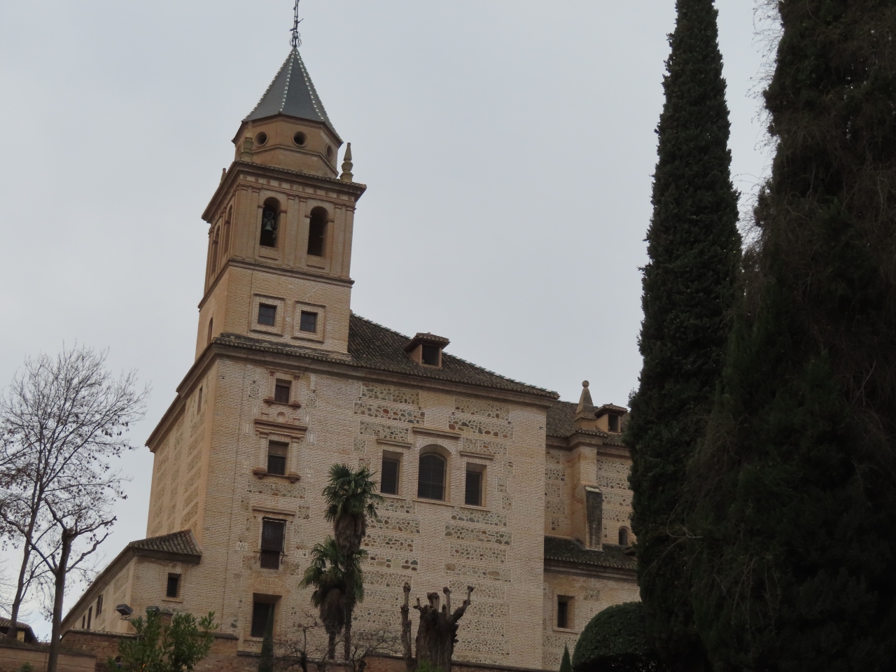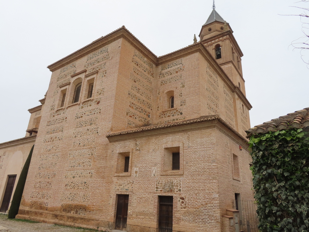 添乗員付きツアーで訪問したアルハンブラ宮殿。あちこちから見えていた尖塔はいったいどこだ?と思いながら帰りにやっとわかりました。真四角のカルロス5世宮殿の隣りにあるこの教会の塔でした。宮殿に隣接と言っていいのか宮殿の一部と言っていいのか。