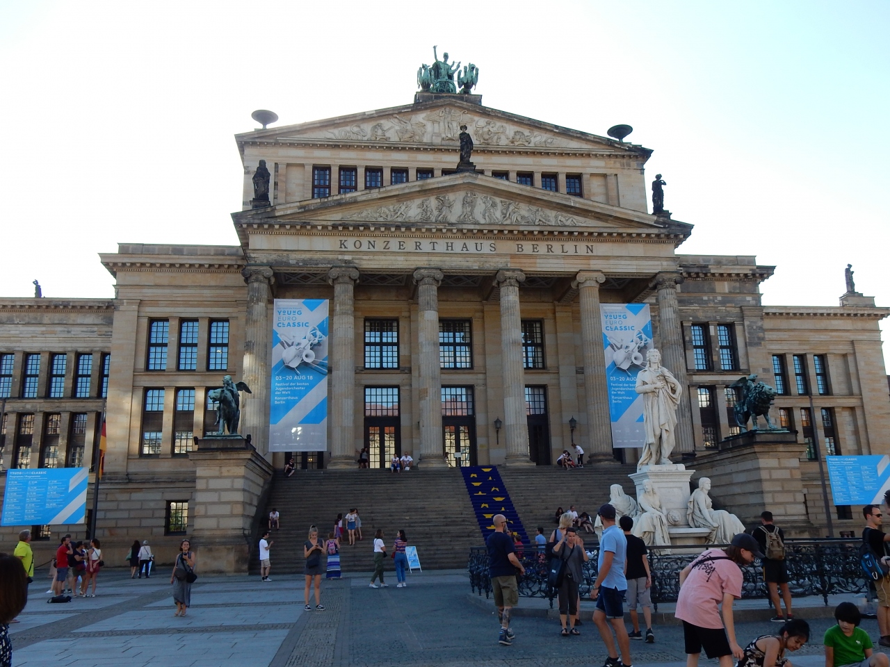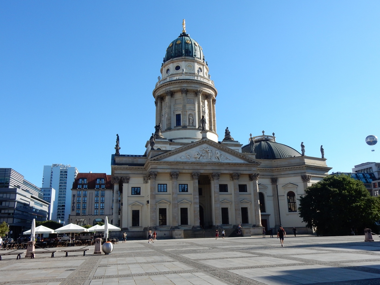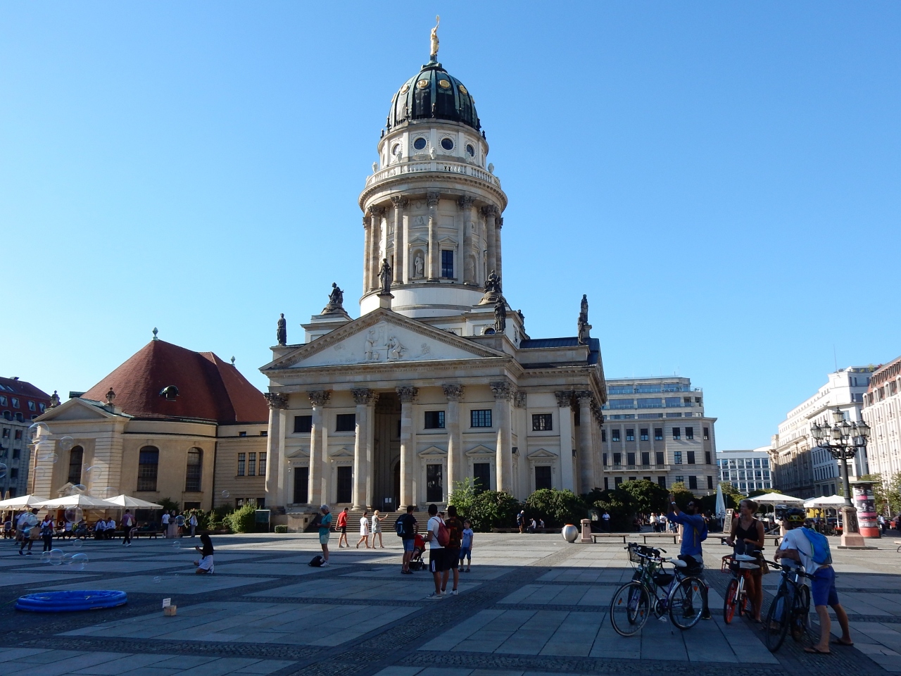 ツアー観光で立ち寄り。だだっ広い広場の正面に音楽堂「コンツェルト ハウス ベルリン」があり、その向かって右に「フランスドム」左に「ドイツドム」という瓜二つの教会が、向かい合っています。クリスマスマーケットの会場にもなる広場だそうです。