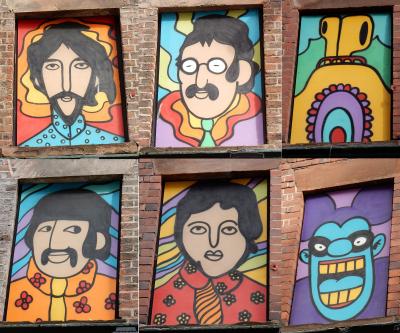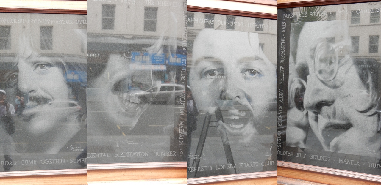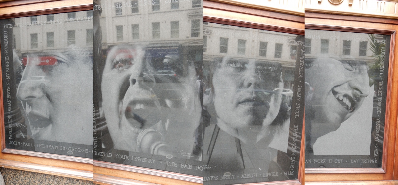 2階部にあるビートルズ4人の像が有名なホテルで、マシューストリート入口にあります。車道沿いのウィンドウに彼らの大きな顔写真がディスプレイされていました。前期と後期と2セット全8枚。ガラスの映り込みが防げませんが。