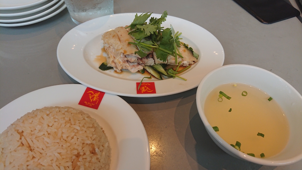 シンガポールのお店で、ここもすごく本店ぽい雰囲気があります。ランチはチキンライスで、普通のとローストチキンが選べました。あと、ほかではみかけない麺とチキンのタイプもあって、この麺がおいしかったです。シンプルですが、意外とボリュームがあります。テイクアウトもやっていました。