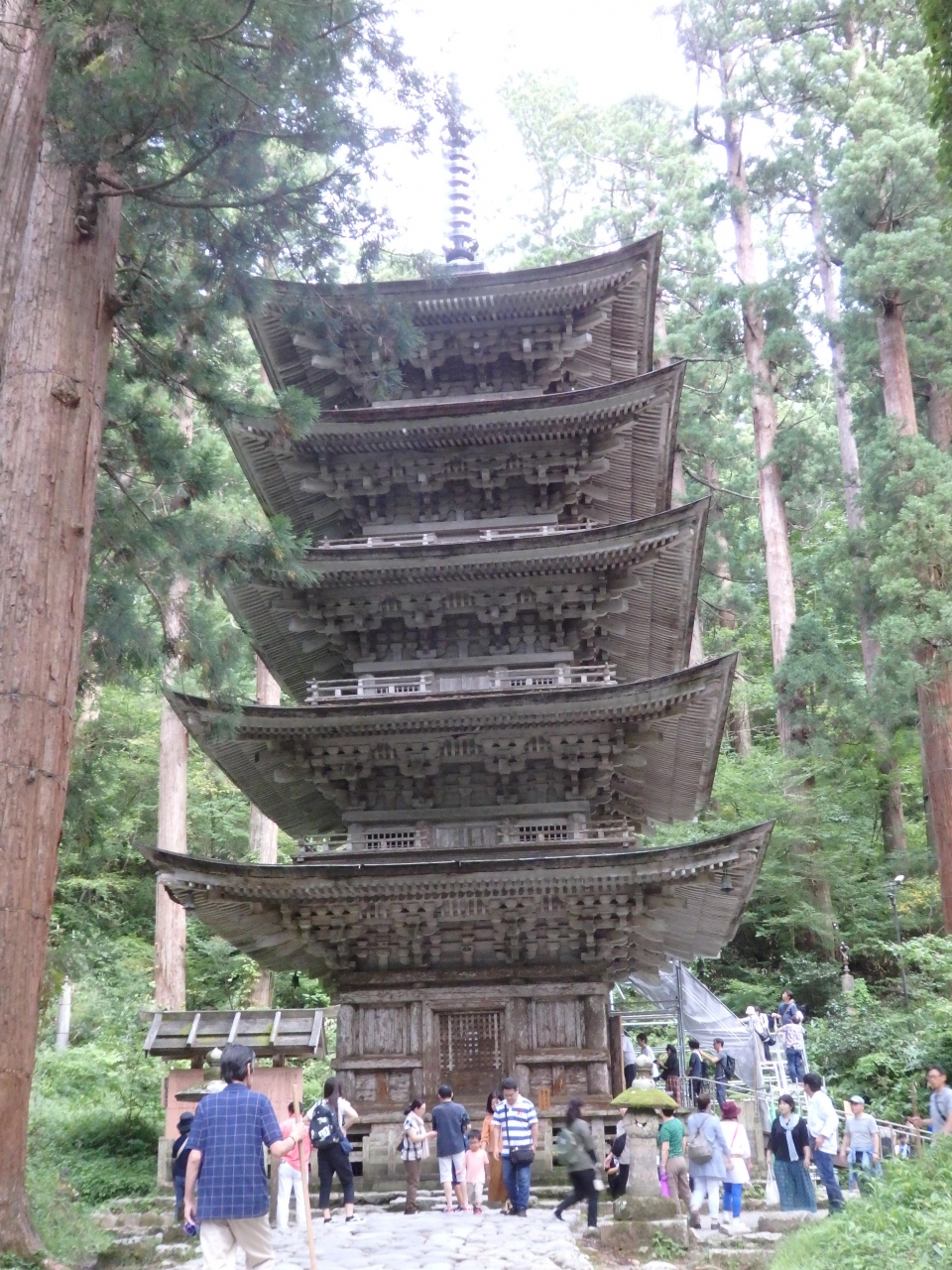 門をくぐって階段を下り、10分程度歩くと突然五重塔が見えてきます。森の中にそびえたっていてなかなかステキでした。