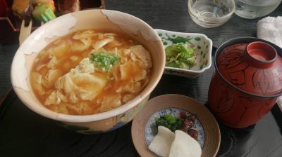 お豆腐料理のお店で、私は湯葉丼と生麩田楽をいただきました。
