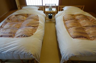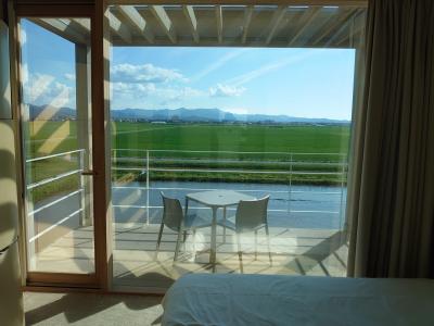 こちらのホテルに宿泊するなら水田ビューの部屋にしたいと思ってました。部屋は少し狭いですが部屋の目の前は田んぼ。気持ちいい稲の景色が広がります。ちょうどそこに赤いトラクターが作業をしていてとても絵になりました。ホテルには大浴場もありました。夕食・朝食共にホテルのレストランで頂きましたが、地元の食材にこだわっている感じがとても良かったです。