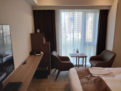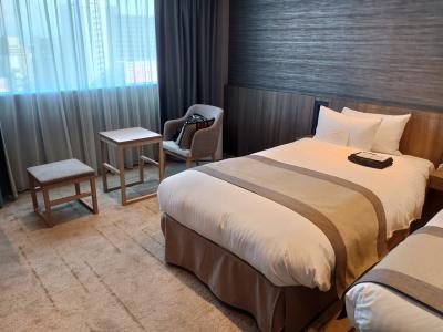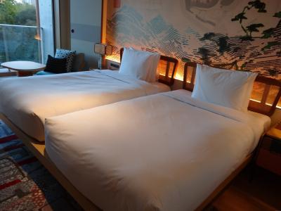 ホテルは新しく綺麗なので気持ちよく過ごせました。部屋は外資系のホテルらしい雰囲気でバストイレ別々なので旅の疲れを癒せます。夕食は付けなかったので部屋でルームサービスを頼みました。夜になるととても映えます。ライトアップされたホテルを写す池がとても綺麗でとても洗練されたホテルでした。
