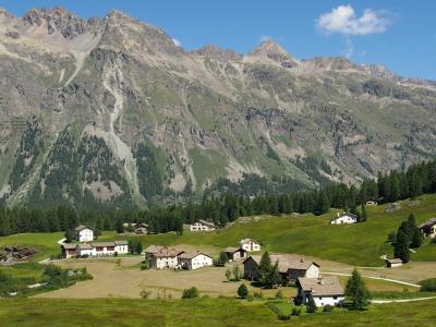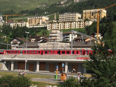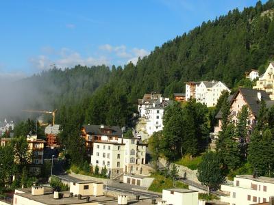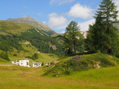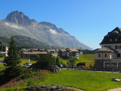 マローヤ峠です。右の建物はホテルマローヤクルム。青空にファイアウィード...