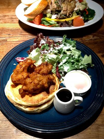 しょっぱいチキンと、メープルシロップをかけた甘いパンケーキは病みつきになる組み合わせです。