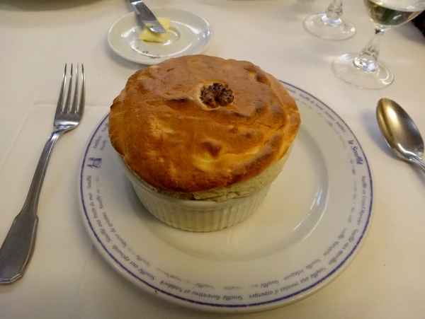 前回食べたきのこのスフレは真ん中の穴にきのこソースをかけて頂くタイプでそこそこおいしかったのですが、今回食べたブルーチーズ&クルミのスフレはかなりしょっぱかったです。