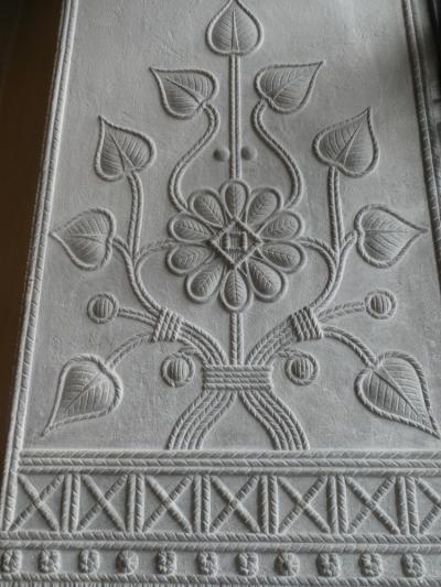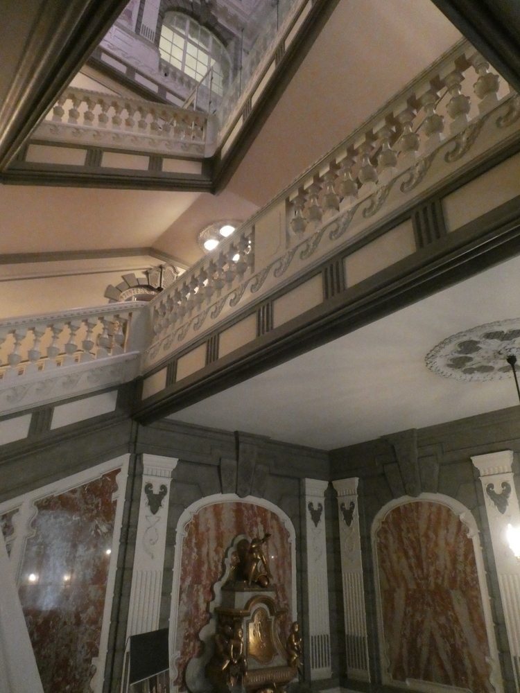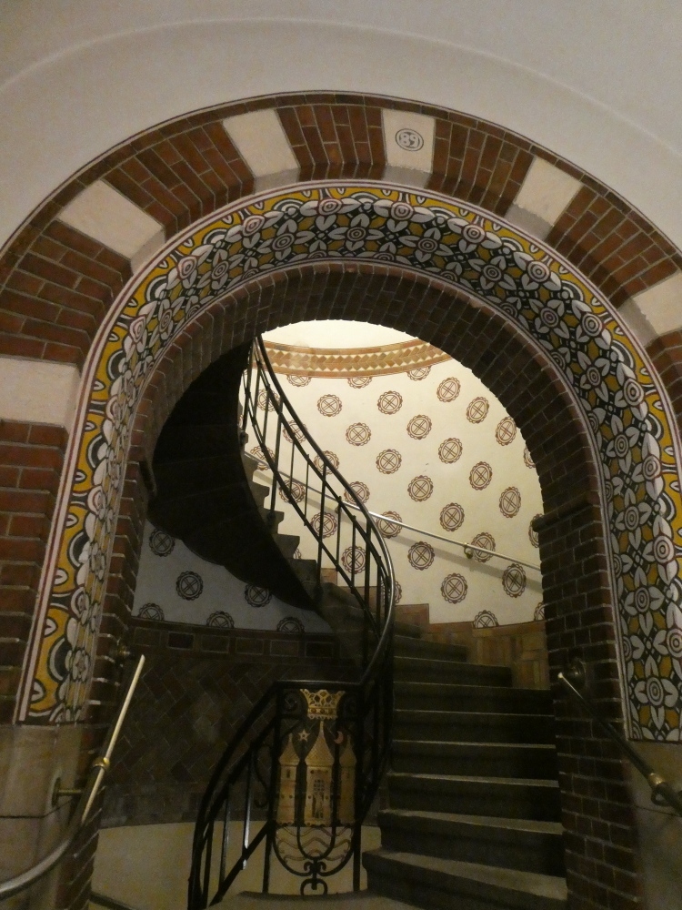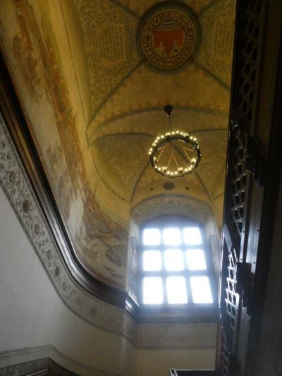 2階へ続く階段は、クラシックな雰囲気の壁紙と細かい装飾の天井が素敵でレトロな印象でした。- 旅行時期