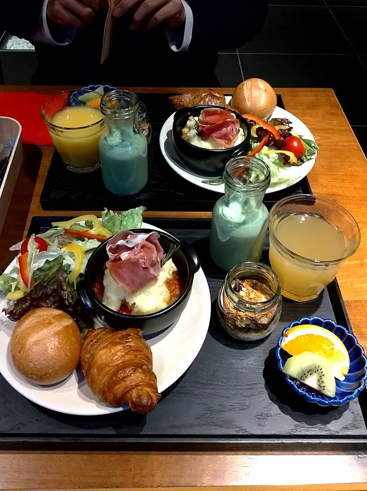 朝食はビュッフェではなくセットになっていて、パンとサラダ、マッシュポテトにミートソースがかかったもの、ヨーグルト、スムージーなどでした。