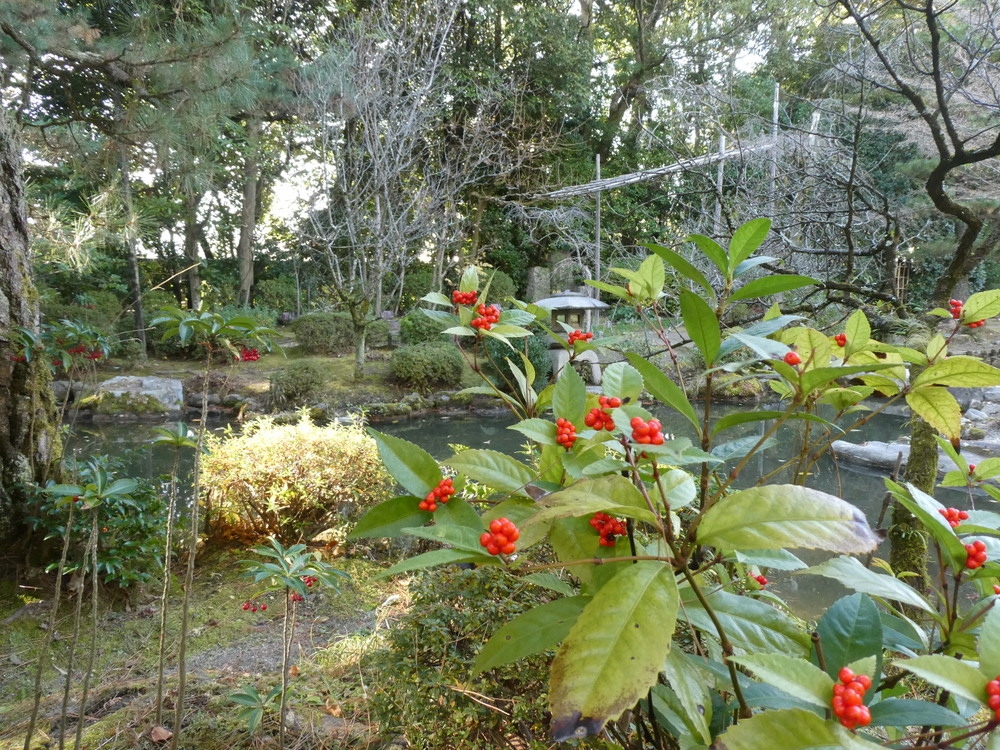 花は咲いていませんが、緑の木と青い空、白い雪。南天の実の赤さが際立っていました。