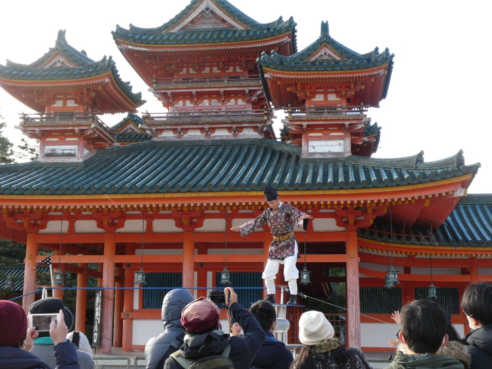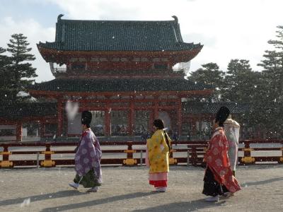 訪れた時はちょうど平安時代の衣装を着た人たちが芸を披露していて、途中から晴天に雪が舞って普段とは異なる風景が見られて得した気分でした。- 旅行時期